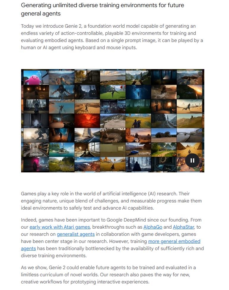 谷歌近日公布了一款名为“Genie 2”的AI生成工具,谷歌将其描述为“大型基础世界模型”,可以用来自动创建一个可玩的3D游戏世界。 谷歌方面强调该工具可用于“快速制作原型”,因为它“使艺术家和设计师能够快速制作原型,从而可以启动环境设计的创作过程,进一步加速研究”。当然除了创造原型外,Genie 2还可以进一步生成NPC及与其的交互;水或重力的物理效果;光照模型和反射;以及多种动画。 对此谷歌表示:“虽然这项研究仍处于早期阶段,在代理和环境生成能力方面还有很大的改进空间,但我们相信Genie 2是解决安全训练具体代理的结构性问题的途径,同时实现迈向AGI(通用人工智能)所需的广度和通用性。” 当然谷歌方面也认为:“Genie 2展示了基础世界模型在创建多样化3D环境和加速代理研究方面的潜力。这个研究方向还处于早期阶段,我们期待在通用性和一致性方面继续提高Genie的世界生成能力。与SIMA(可扩展可指导多世界代理)一样,我们的研究正在朝着更通用的人工智能系统和代理的方向发展,它们可以理解和安全地执行各种任务,从而对在线和现实世界中的人们有所帮助。” 因此,尽管Genie 2的潜力是显而易见的,但目前它的用途似乎并不在于视频游戏的直接开发上。 |