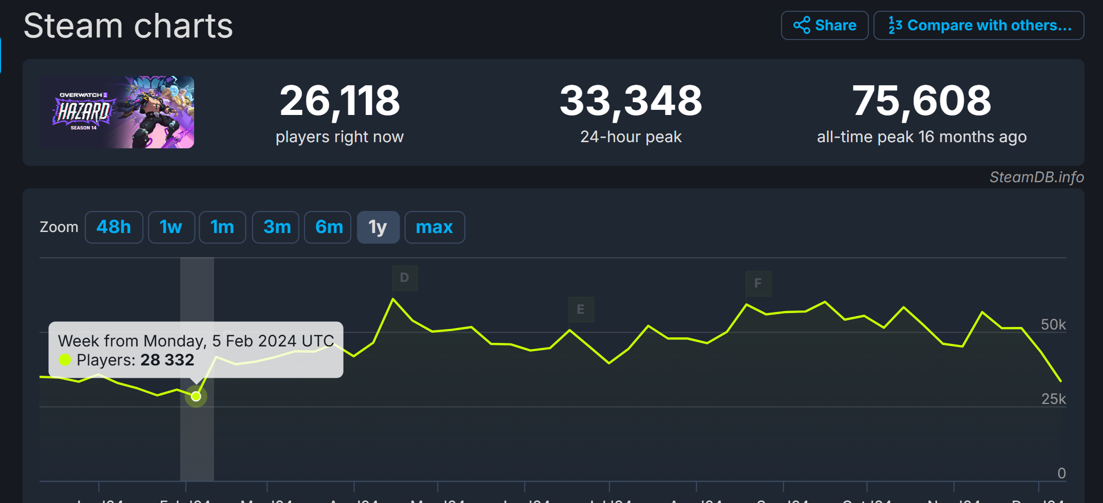《守望先锋2》Steam在线人数出现大幅度下滑,当前在线玩家只有26118人,是该作今年在Steam平台玩家人数最少的一次。 可以看到下图,今年《守望先锋2》Steam平台在线玩家较少的一次出现在2024年2月5日,当时仅2.8万人,而今年12月的数据更少,只有2.6万人。 这一数据下滑恰恰发生在网易同类游戏《漫威争锋》上线之际(12.6),后者仅用了3天时间就达到了千万玩家,保持了和EA、重生娱乐《Apex英雄》相同的记录。 《漫威争锋》的玩家友好模式吸引了国外大量玩家的注意,被誉为“守望先锋杀手”。《漫威争锋》通过漫威人气角色阵容、易用的进度系统和跨平台游玩吸引了玩家的兴趣,不像《守望先锋2》,本作没有恶意推广微交易,可让玩家在游戏内就能赚取物品和皮肤。 |