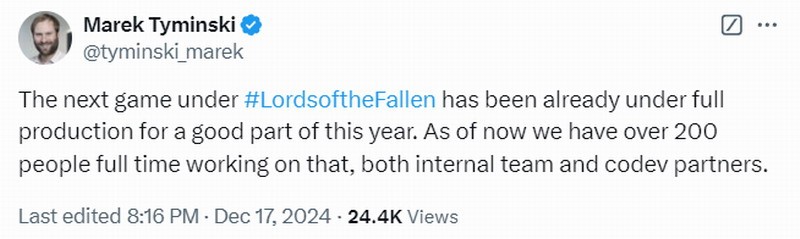 Marek表示《堕落之主2》已进入全面制作阶段,有200多名开发人员参与其中。内部预测游戏将于2026年发布,游戏营销将于2025年某个时候开始。