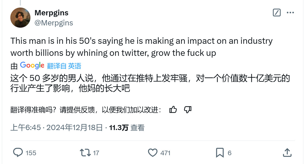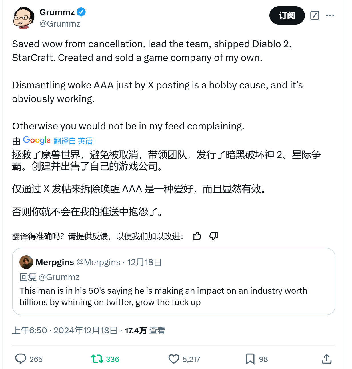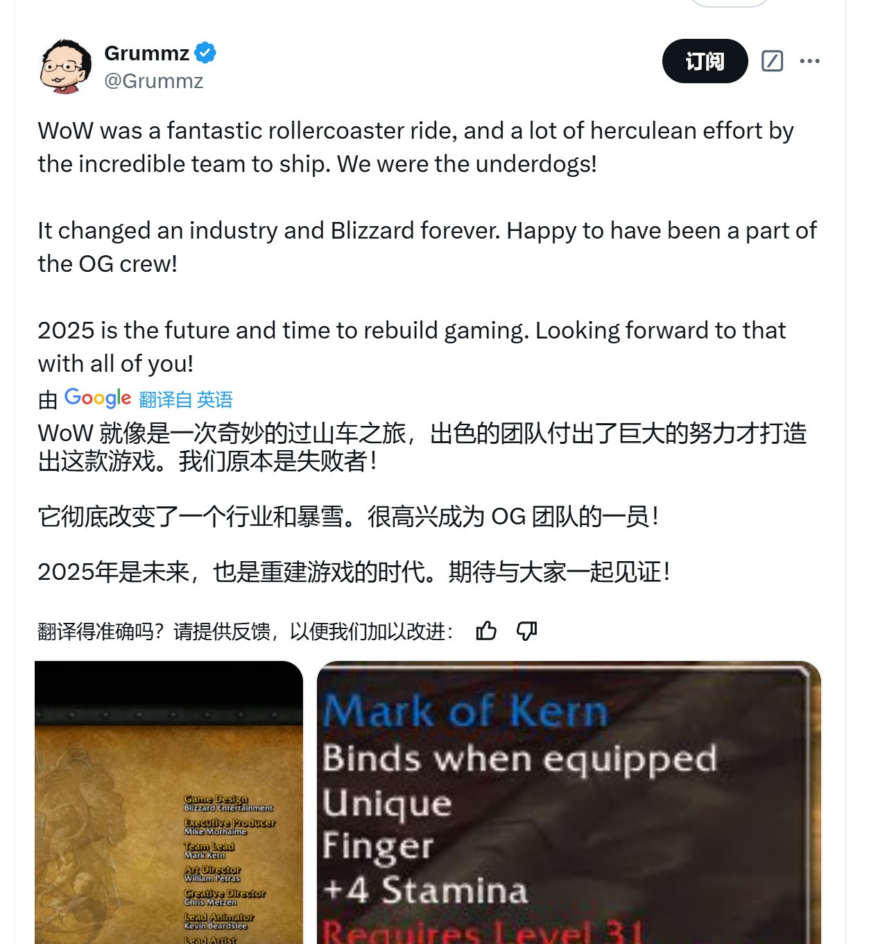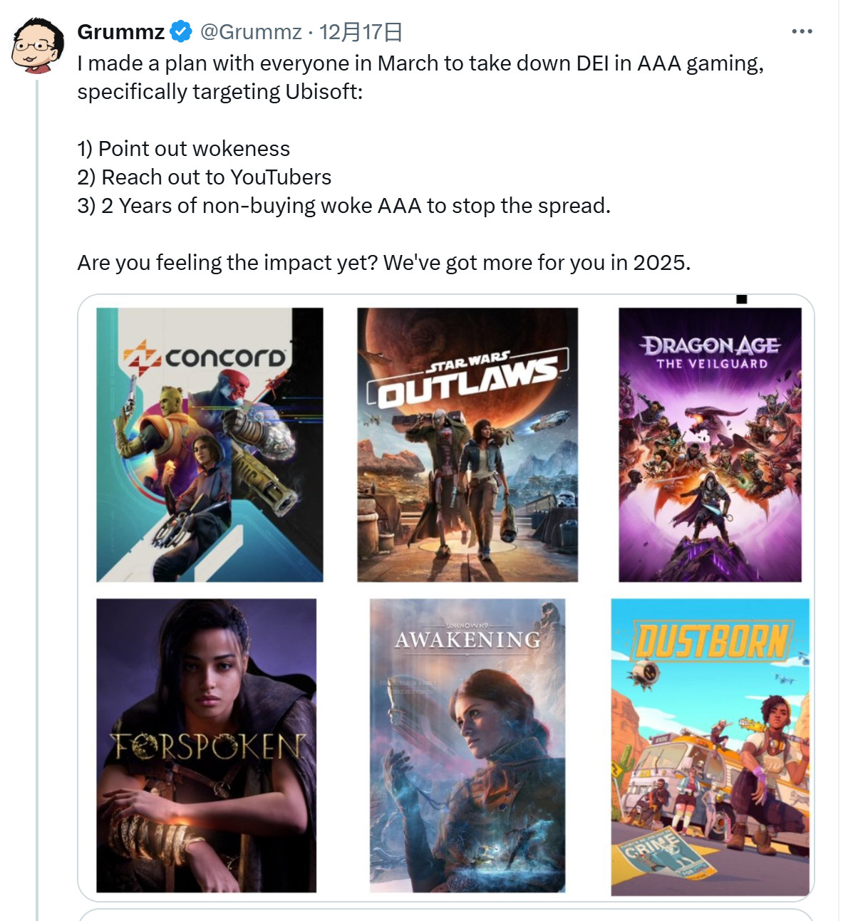 近日知名反Woke推主Grummz(真名Mark Kern)在X上发帖,晒出自己今年的“成绩单”。他说今年3月才计划干掉3A游戏中的DEI,尤其是针对育碧。显然他已经收获颇丰,在其影响下,一些大作比如《星鸣特攻》、《星球大战:亡命之徒》、《龙腾世纪:影障守护者》都遭到了大量玩家的抵制,导致这些厂商损失惨重。 Grummz还列出了三步走步骤:指出woke元素——联系油管自媒体人士——2年内不买阻止扩散。Grummz表示2025年回“继续战斗”。 他的这一发帖获得了43万次观看,证明有了不小的影响力,评论区有大量玩家感谢Grummz。但也有玩家称“这个人都50多岁了,竟然还说仅在X上发牢骚就对价值数十亿美元的游戏行业产生了影响,赶紧TM地快长大吧。” 在被指责50多岁一事无成后,Grummz反驳了这名玩家,他说:“我曾拯救了《魔兽世界》,避免它被暴雪取消,带领了团队,推出了《暗黑破坏神2》、《星际争霸》,创建并出售了自己的游戏公司。只靠X发帖就把觉醒3A游戏拆得七零八落是我的爱好,而且显然很有效。否则你就不会在我的推文中抱怨了。” 对于玩家的怀疑,Gummz继续发帖,晒出一张图片,显示Mark Kern确实是《魔兽世界》的团队领导(team lead),甚至游戏中还有以他名字命名的装备。 |