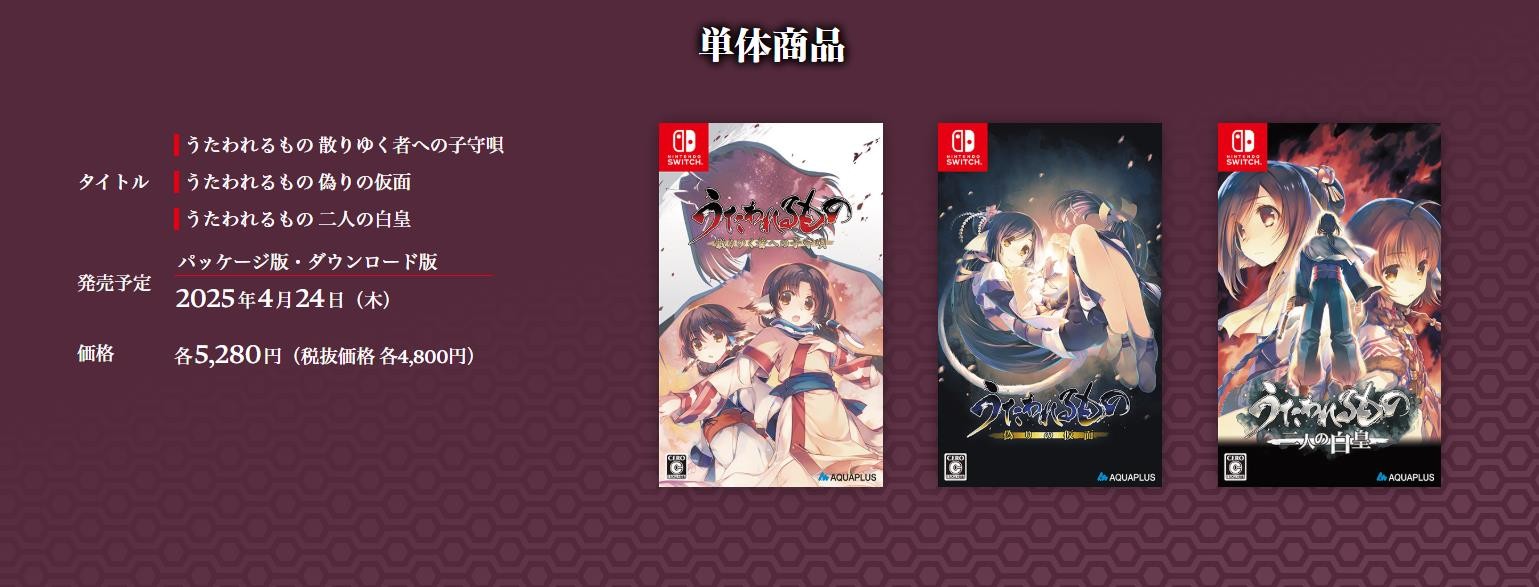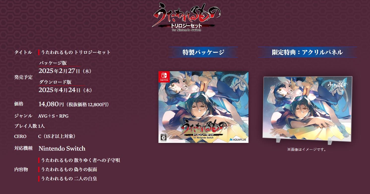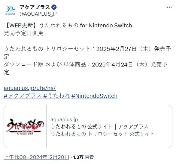 12月20日,发行商AQUAPLUS宣布《传颂之物》三部曲Switch版(日服)将延期发售,这包含了《传颂之物》系列的三部作品:《传颂之物:给逝者的摇篮曲》、《传颂之物:虚伪的假面》、《传颂之物:二人的白皇》,实体版由原定的2025年1月30日延期到2025年2月27日,三部曲数字版和单独作品(实体版和数字版)由原定的2025年3月27日延期到2025年4月24日。 目前《传颂之物》系列的三部作品《传颂之物:给逝者的摇篮曲》、《传颂之物:虚伪的假面》和《传颂之物:二人的白皇》已在全球登陆PS4、PSV和Steam,Steam版支持繁体中文,本次的Switch版是否支持中文暂未公布。 |