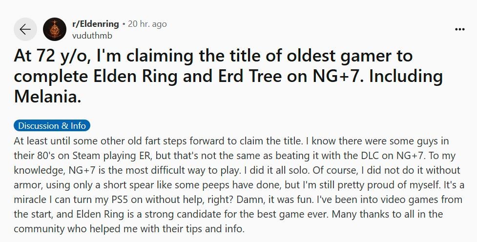 一位72岁的《艾尔登法环》玩家完成了游戏本体及“黄金树之影”DLC八周目的挑战,实现了令人难以置信的成就。这对任何《艾尔登法环》玩家来说都是令人印象深刻的成绩,但对于72岁的玩家来说更是如此。 《艾尔登法环》可以说是迄今为止From Software最难的游戏之一。From Software的游戏吸引力之一就是其高难度,大多数玩家需要极大的耐心才能通过各种考验和磨难。然而,一些《艾尔登法环》的玩家会给自己设定自我限制,以使游戏体验更加困难。例如,有一位玩家用跳舞毯打败了DLC Boss。这些Boss本身就已经很难,而有些玩家能够用跳舞毯打败他们,无疑说明这些高手早已对这款游戏了如指掌。 Reddit用户vuduthmb声称自己是完成《艾尔登法环》本体和《黄金树之影》DLC八周目难度的最年长玩家,这需要总共通关八次游戏。他开玩笑表示将一直卫冕这一这个头衔“直到其他老家伙站出来挑战。”《艾尔登法环》的多周目并不意味着一定会变难,但八周目确实相比一周目要困难很多。 |