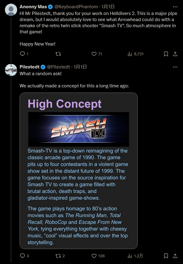 近日在社交媒体上,《绝地潜兵2》开发商 Arrowhead 工作室的创意总监 Johan Pilestedt 透露,团队正在研究新做的“高层概念”,并邀请玩家一同对新作进行猜测。 他在过年前发布推特问玩家:“你们对下一款 Arrowhead 的游戏有什么样的期望和愿景?我正在研究高层概念,我很想听听各位的猜测。” 一位粉丝表示,非常希望看到工作室对复古双摇杆游戏《Smash TV》进行重新诠释,而 Pilestedt 则透露,实际上他在十几年前曾有过类似的想法,并分享了当时自己写的对游戏的概念描述。 此外,还有粉丝希望看到一款以《绝地潜兵》中备受欢迎的“飞鹰战机”为主角的,类似《星际火狐》的游戏。Pilestedt 也表示,他们之前也有过类似的构思,并且分享了游戏的概念图。显然这是一款第一人称的轨道飞行射击游戏,看起来也是非常的有趣。 最终,似乎没有人猜对工作室的新作,又或者有人猜对了,但是 Pilestedt 并没有回应?你希望看到这家工作室推出什么样的新作呢?除了《绝地潜兵》外,工作室还推出过《魔能(Magicka)》系列。 |