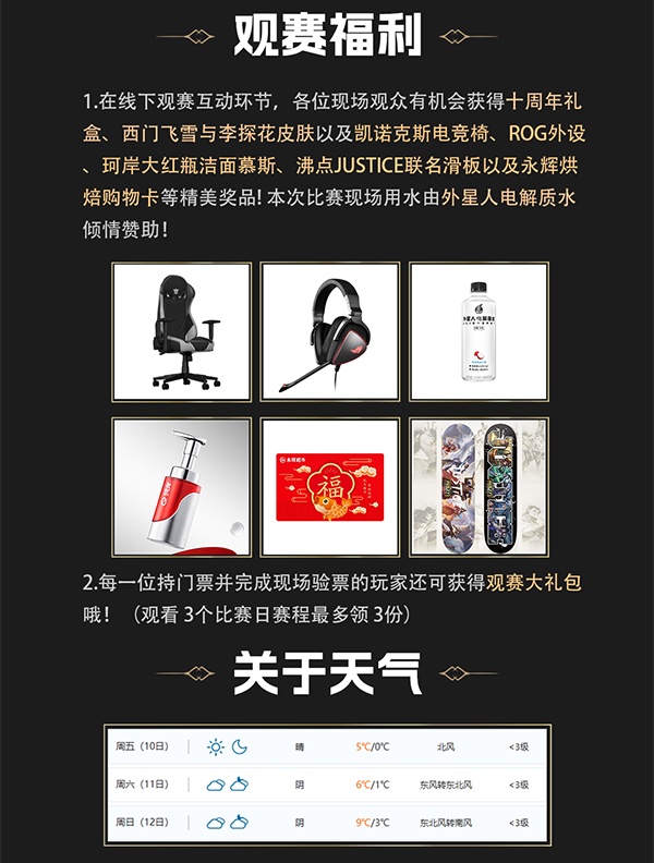 每一位检票入场的观众都能拿到一份观赛大礼包哦!除此之外,神秘的十周年礼盒、精美皮肤以及各类电竞椅、外设等精美奖品本次都有机会解锁!超多的观赛福利等待着各位魂友们开启!