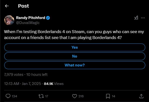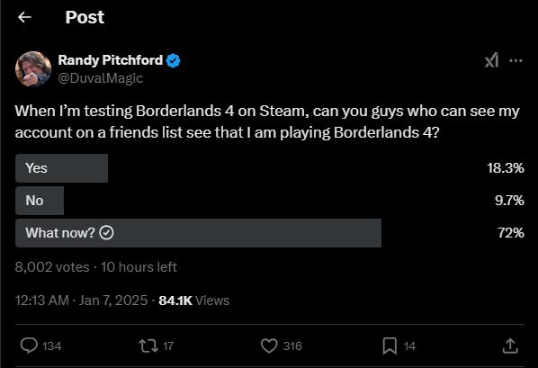 Gearbox此前宣布旗下刷宝射击游戏系列的最新作《无主之地4》将会在2025年发布,并且不再独占Epic平台(《无主之地3》曾在Epic平台独占)同步登录Steam平台。 近日Gearbox的首席执行官Randy Pitchford在其个人推特中发布了一则调查问卷推文,并在其中提问:“假如我正在Steam平台上测试《无主之地4》,你们有谁能在好友列表中看到我的帐户信息吗?” 在这条推文下的三个选项中,由18.3%的人选择了“可以”,9.7%的人选择了“不可以”,而高达72%的人选择了“什么?是现在?”。 虽然可以视作这是Randy Pitchford为《无主之地4》设计的宣传手段,但也能推断Gearbox有意图在Steam平台推出《无主之地4》的测试或试玩版本,不过目前并未透露具体内容和时间。 |