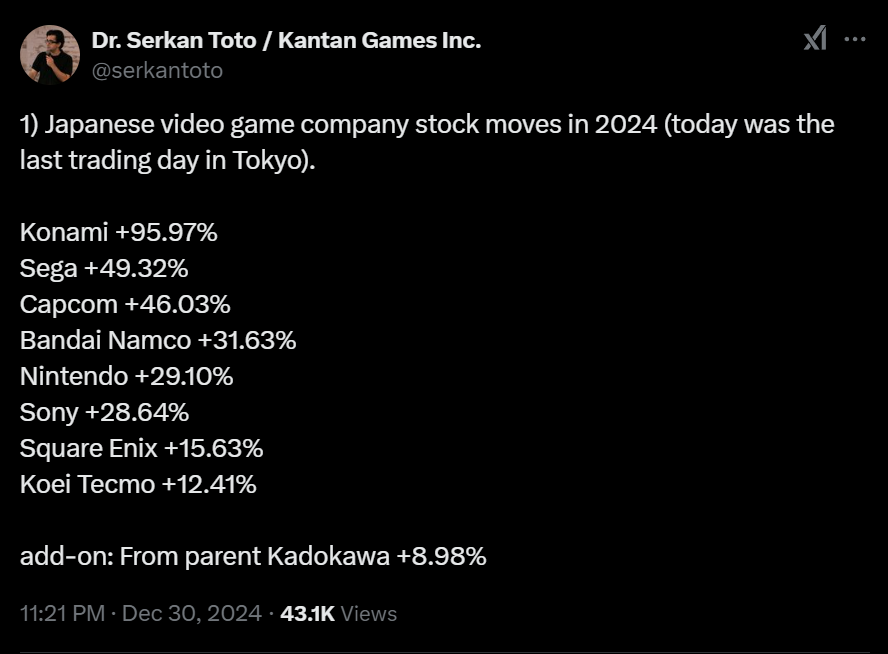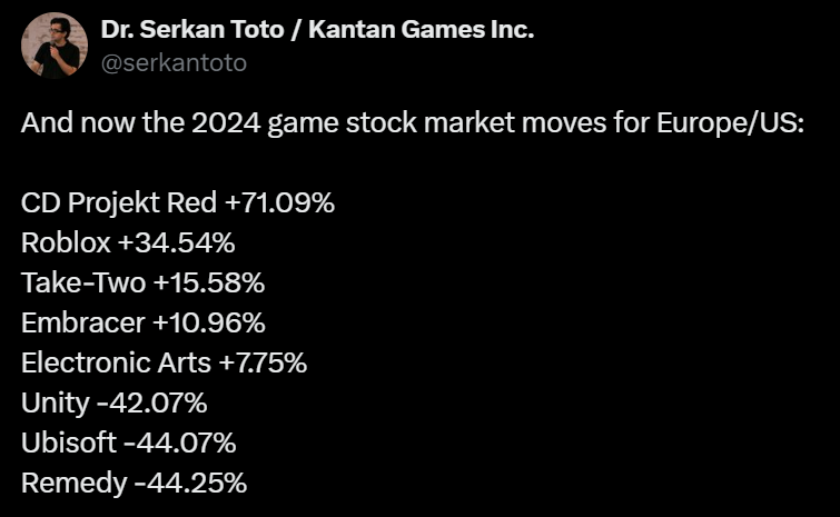 根据 Kantan Games 分析师 Serkan Toto 分享,日本电子游戏公司在 2024 年的股市表现大幅领先欧美公司。其中,由于《寂静岭2:重制版》的热销,科乐美股价涨幅 95.97% 位居第一。 日本公司: 1. 科乐美 +95.97% 2. 世嘉 +49.32% 3. 卡普空 +46.03% 4. 万代南梦宫 +31.63% 5. 任天堂 +29.10% 6. 索尼 +28.64% 7. 史克威尔·艾尼克斯 +15.63% 8. 光荣特库摩 +12.41% 9. 角川 +8.98% 欧美公司: 1. CDPR +71.09% 2.罗布乐思 +34.54% 3. Take-Two +15.58% 4. Embracer +10.96% 5. EA +7.75% 6. Unity -42.07% 7. 育碧 -44.07% 8. Remedy -44.25% |