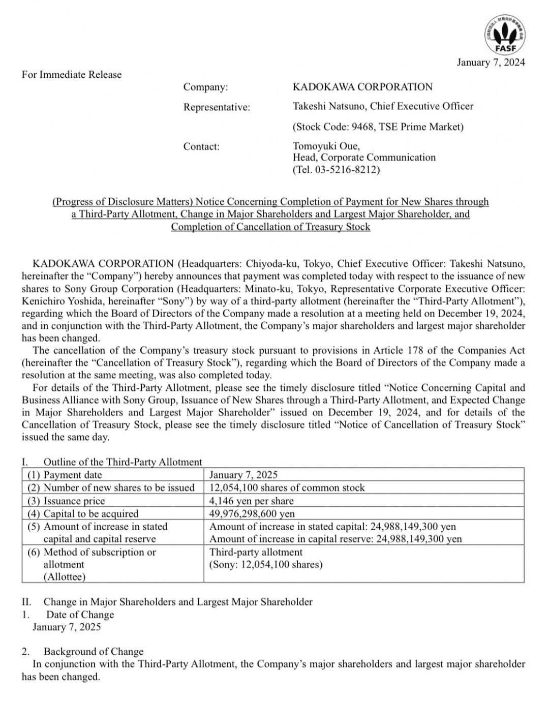 虽然索尼没有收购FromSoftware母公司角川集团,但去年12月,索尼以3.3亿美元收购了角川10%的股份。截止1月7日,索尼已经交清了款项,索尼现已成为角川最大的股东。 角川刚在官网上发布了官方声明,宣布索尼目前是其最大股东,持有10.11%的股份。 “角川株式会社特此宣布,关于公司董事会于2024年12月19日召开会议时做出决议的通过第三方配售方式向索尼集团公司发行新股一事,今天已完成支付。伴随此次定向增发,公司的主要股东和最大股东已发生变更。” 根据官方声明,将发行1205万4100股普通股作为新股。这些股份现在由索尼持有,使其成为公司的最大股东。 粉丝们对此表示担忧,但这可能是件好事,因为FromSoftware终于有可能获得《血源》的版权,并开发备受期待的PC移植版或为游戏增加60FPS支持。 |