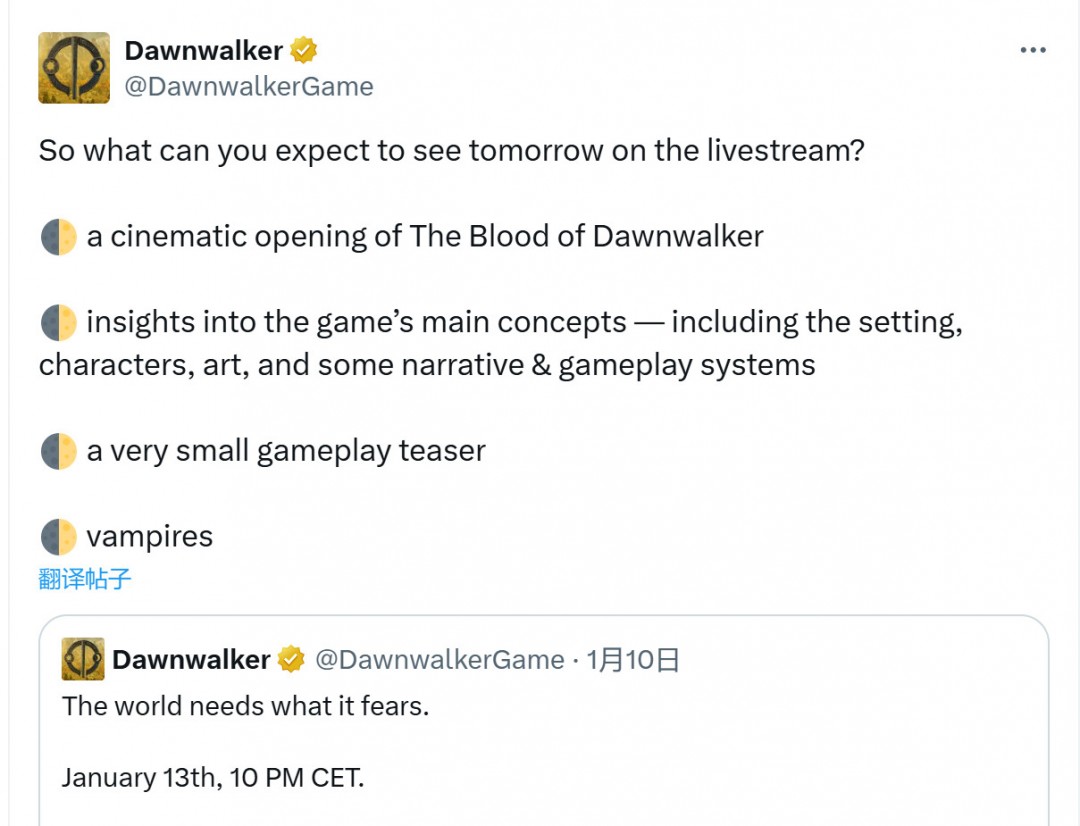 由前《巫师3》核心团队成立的Rebel Wolves(反叛之狼)工作室推出的首个3A动作RPG游戏《The Blood of Dawnwalker》,即将于1月14日早晨5点通过直播正式公开。今日,游戏官推发布了这次直播玩家可以期待的内容。 1.《The Blood of Dawnwalker》的开场动画 2.深度介绍游戏的主要概念,包括设定、角色、美术和一些叙事/玩法系统 3.一个非常小的玩法前导预告片 4.吸血鬼 此前,Rebel Wolves曾发布了《The Blood of Dawnwalker》的前导预告,确认故事背景设定在中世纪欧洲,和《巫师3》类似,也是一个黑暗幻想RPG。 而根据游戏的官网,在《The Blood of Dawnwalker》游戏中,玩家似乎要操作一个白天是人形、夜晚化身吸血鬼的英雄。 |