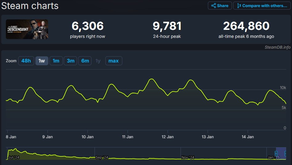 《第一后裔》在2024年夏季通过免费游玩模式,吸引了不少玩家,Steam玩家数峰值曾达到26.4万人。然而六个月后,《第一后裔》玩家流失超95%,目前最高峰值仅为9781人。 《第一后裔》目前在Steam上总评为“褒贬不一”,玩家们抱怨游戏任务重复、外观“肤浅”、微交易费用昂贵,游戏玩法乏味。游戏总监Joo Min-seok也承认《第一后裔》有很多不足之处,他们会不断改进的。 Nexon目前面临艰巨挑战,他们必须在《第一后裔》中提供更吸引人的新更新,来恢复玩家基础。2025年将是该作重获优势的关键年份,如何在竞争激烈的服务型游戏市场保持相关性的竞争,Nexon的策略将至关重要。 |