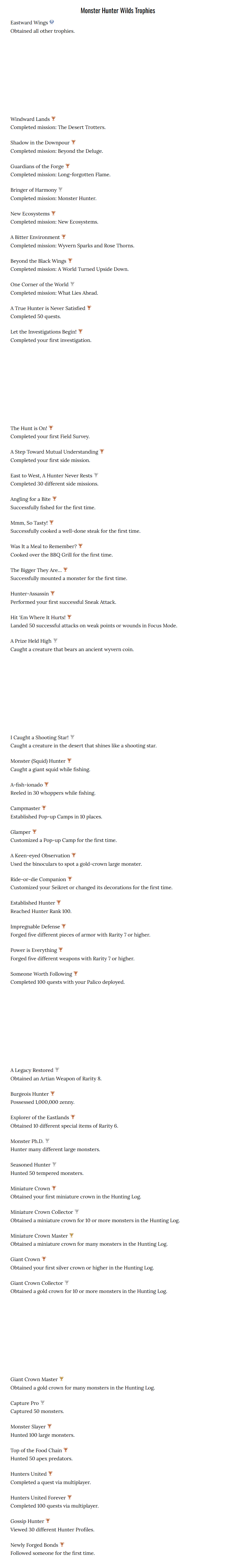 该奖杯列表与《怪物猎人:世界》的列表非常相似,仍然包含“大小金”奖杯,这也是游戏获得白金杯过程中最耗时和最费力的部分,值得一提的是,《怪物猎人:世界》的“白金率”为4.62%。以下是全奖杯列表(包含剧透):