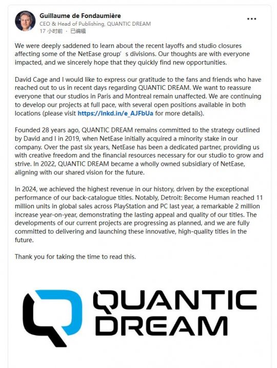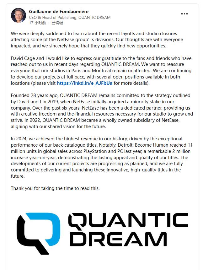 近日,在网易缩减海外投资、关闭海外工作室的报道传出之后,《星球大战:日食》、《底特律:化身为人》的开发商量子梦(Quantic Dream)工作室回应了粉丝们担心的问题,该工作室于2022年8月被网易收购,粉丝们担心他们也在网易缩减投资的范围之内。 在最近的领英帖子中,量子梦工作室的首席执行官和发行主管Guillaume de Fondaumière谈到了他们目前的状况,他对网易旗下某些工作室关闭和裁员深感悲痛,但量子梦工作室旗下的两个分支机构:巴黎办事处和蒙特利尔办事处,都不会受到任何不利影响,他们的项目正在全速推进中,甚至最近还在招聘新员工。 Guillaume de Fondaumière还透露称2024年是该公司历史上收入最高的一年,这主要得益于《底特律:化身为人》销量的增长,与2023年相比,该作的销量增加了200万份,使得游戏总销量超过了1100万份。 此外,量子梦工作室目前正在开发新作《星球大战:日食》,Guillaume de Fondaumière强调称项目正在按计划进行中,该作最初于2021年12月公布,发售日期和登陆平台暂未公布。 |