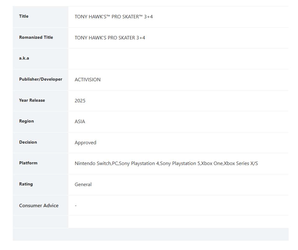 近日,《托尼霍克职业滑板3+4》被发现在新加坡通过了评级,级别为“General”,平台为PS5、PS4、Xbox Series X|S、Xbox One、Switch和PC。目前,EA还没有正式公布《托尼霍克职业滑板3+4》,而根据《托尼霍克职业滑板》游戏官网的倒计时页面,这款游戏可能会在3月4日发布官方公告。