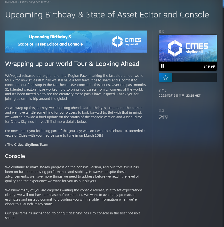 在系列 10 周年纪念日之际的开发者更新中,发行商 Paradox Interactive 透露,《城市:天际线2》的 Xbox Series 和 PS5 主机版本还要等上一段时间。 P 社表示,开发商 Colossal Order 的团队正在主机版开发上取得“稳定进展”,并补充称主机版开发的核心重点是性能和稳定性改进。然而“为了让游戏达到我们希望玩家获得的质量和水平”,还有很多事情要做。 公司写道:“我们知道你们中的许多人都在热切地等待主机版的发布,但要明确设定期望:我们不会在夏季之前发布。我们希望避免任何过早的估计,而是承诺在我们接近发布准备就绪状态时为您提供可靠的信息。” 最后 P 社总结成,主机版的目标依然保持不变,即将游戏以“最佳状态”带到主机上。 《城市:天际线2》主机版本原本计划于 2023 年 10 月与 PC 版一同推出,但之后被推迟至 2024 年。然而,由于“硬件限制问题”,游戏的主机版一直推迟至了今年。 |