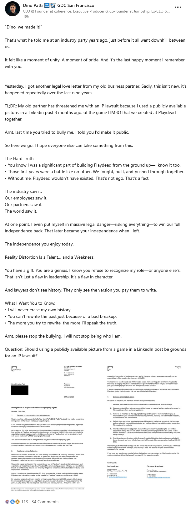 《地狱边境》、《Inside》开发商 Playdead Studios 联合创始人 Dino Patti 最近透露,自己与另一名工作室创始人 Arnt Jensen 在关系“恶化”后,一直受到来自 Jensen 的威胁,声称要对他提起法律诉讼。 Patti 在 3 月 3 日收到了最新的诉讼“威胁”。这封信件中,Jensen 声称 Patti 去年末发布的一篇讨论《地狱边境》开发的领英长篇帖子侵犯了版权。这篇已经删除的帖子中,包含了一张 Jensen 声称“未授权”的图片,而 Jensen 则要求 Patti 支付 50 万丹麦克朗的补偿。 声明写道:“我们想重申并警告,您继续使用 Playdead 的资产以及出于商业目的披露和利用有关 Playdead 的内部信息都是侵权行为,并构成违反保密条款。通过向外部人员提供有关《地狱边境》开发过程的核心见解,您错误地给人留下了这样的印象:您在游戏开发中扮演了重要角色,包括创造性职位。” Playdead 于 2010 年发布了《地狱边境》,并于 2016 年推出了《Insider》。Patti 在 2017 年离开了工作室,并创立了另一家工作室 Jumpship。当时 Patti 表示自己和 Jensen 之间“存在某种分歧”。 据 Patti 目前称,Jensen 在过去 9 年里“多次”威胁要对他采取“法律行动”。他之所以现在公开这些事情,是因为“上次(Arnt)试图欺压我时,我告诉(他)我会曝光此事。”Patti 还表示,他本人是“从零创立 Playdead 的重要部分……没有我,Playdead 就不会存在。这并非自大。这是事实。” 他继续写道:“Arnt,请停止威胁行为。我不会改变自己的身份。我永远不会抹去自己的历史。你不能因为一次糟糕的分手就试图改写历史。”他还在帖子回复中表示,他已经告诉 Jensen 自己“很乐意找到一个让你律师不用每 6 个月给我写一封充满废话的信的解决方法。我的电话随时畅通。” 目前 Patti 仍在 Jumpship 工作,这家工作室于 2022 年被 Thunderful 集团收购,并在同一年发布了冒险游戏《萨默维尔》,获得了许多好评。今年 2 月,Patti 还从 Thunderful 受众买回了工作室。 在 2016 年至今的 8 年里,Playdead 没有发布任何一款游戏,不过确定在开发一款新作,由 Epic Games 负责发行。但是关于新作仍然没有任何消息。 Playdead 尚未回应媒体的置评请求。 |