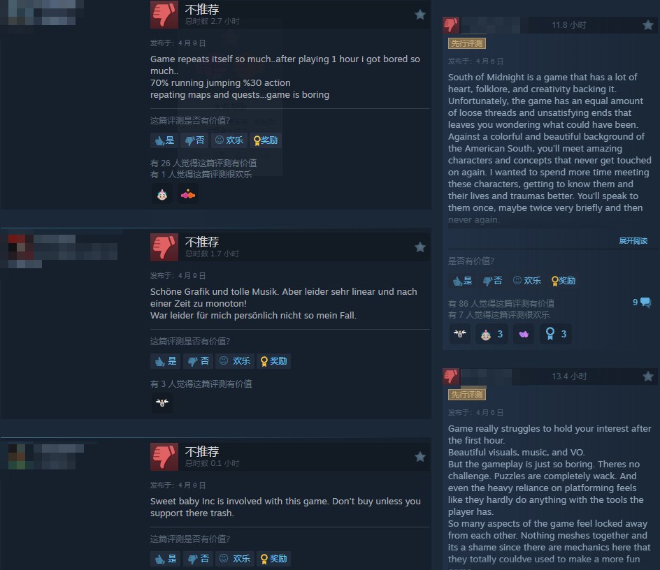 动作冒险游戏《午夜以南》已在XSX|S和PC上发售,首发加入Game Pass。Steam国区标准版售价198元,豪华版售价248元。该作在Steam上总评为“特别好评”,好评率92%。有玩家表示,这游戏出乎意料的好玩! 《午夜以南》是一款引人入胜的第三人称动作冒险游戏,将带你深入美国南部神秘腹地。你将扮演主角黑泽尔揭开南方神话的面纱,并在一个充满诡异与奇幻色彩的世界中,与南方民间传说中的神秘生物相遇。当一场灾难席卷黑泽尔的家乡时,她接受了命运的召唤,成为了一名能够修复破碎纽带并抚慰灵魂的编织者。凭借这些新获得的力量,黑泽尔将直面并驯服危险的生物,解开家族昔日纠葛的谜团。如果她够幸运的话,也许能找到属于自己的心灵归宿。 给予好评的玩家认为,《午夜以南》出乎意料的好玩,如果把女主的脸换了就更好。人物表情动作和配音都很自然,美术很赞。虽然战斗中规中矩,但音乐和剧情都很棒!整体感觉很接近《爱丽丝:疯狂回归》。 给予差评的玩家认为,这是《双刀黑妹历险记》,战斗手感很差,剧情也就那样。游戏很无聊,重复的地图和任务。还有人大呼Sweet Baby Inc参与了这款游戏,不要买这游戏。 |