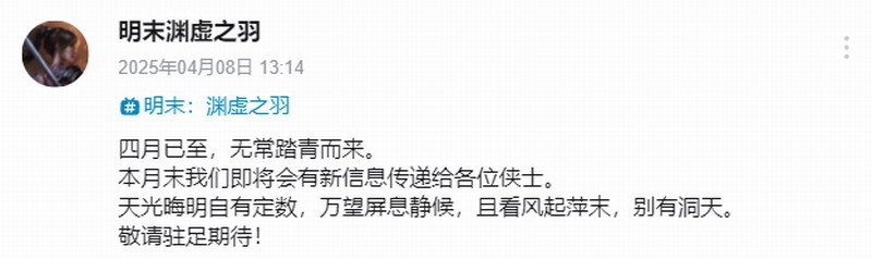 官方表示:“四月已至,无常踏青而来。本月末我们即将会有新信息传递给各位侠士。天光晦明自有定数,万望屏息静候,且看风起萍末,别有洞天。敬请驻足期待!”