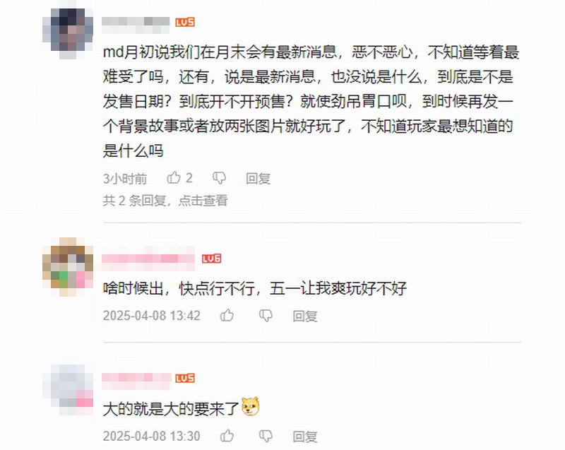 评论区有许多玩家表示很期待,有人猜测是4月25日公布消息,因为崇祯就是在那天自缢的。还有人称官方宣发吊胃口,赶紧公布发售时间。有玩家说:“预购什么时候开始?能不能五一让我爽玩!”