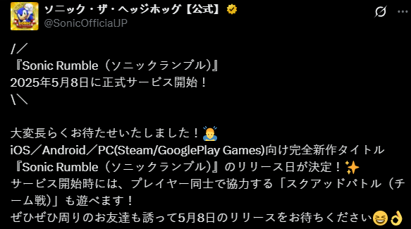 世嘉宣布,旗下系列全新乱斗类游戏《索尼克大乱斗》5月8日iOS、Android、PC(Steam、Google Play Games)多平台发布,游戏基本免费,32名玩家大混战即将开幕。