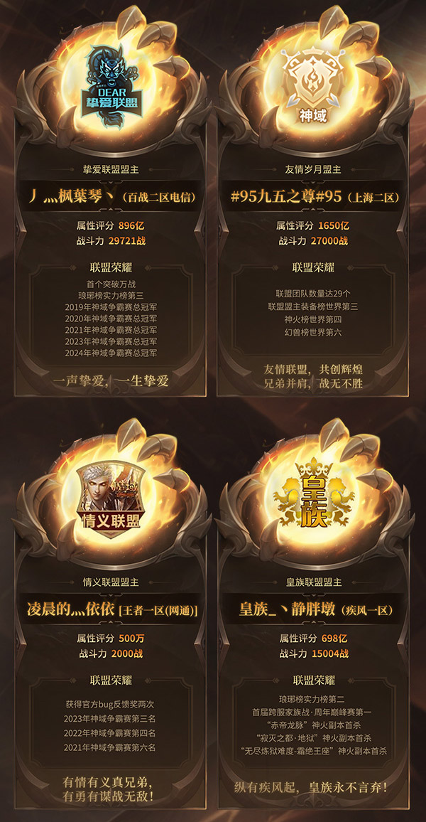 群雄逐鹿,硝烟已起!2025年《魔域》神域争霸赛即将于4月15日点燃战火!四场鏖战,四重巅峰,究竟是卫冕王者续写传奇,还是新皇加冕,让我们拭目以待!本次赛事还将承载1300万点魔石的惊世悬赏,观赛竞猜亦有最高13800点魔石相赠!荣耀之巅试看谁人登顶! 参战联盟百家争鸣 是新王登基还是传奇续写? ? 神域争霸赛堪称《魔域》最具含金量的"全明星战役",每个联盟的名字背后都承载着震颤服务器的赫赫威名。卫冕冠军"挚爱联盟"在盟主"丿 灬枫葉琴"率领下剑指连冠,没有人比他们更熟悉身处巅峰的自信;而上届比赛离冠军只有一步之遥的“皇朝联盟”如今也已登顶琅琊榜实力榜,联盟主“皇族_丶苛苡”自然不会放过这个成就新王加冕传奇的机会;“皇族”家族的另一名成员“皇族_丶静胖墩”也将率领“皇族联盟”参与角逐,琅琊榜实力榜第二名的含金量同样不容小觑;而在24年跨服战中横扫六合的"开心联盟"、联盟盟主装备榜世界第三的“友情岁月”、以及逍遥、情义、羁绊、死神等诸多老牌联盟同样拥有搅动风云的能力。纵观豪华的参赛联盟名单,每个联盟都具备问鼎实力,胜负或许只在毫厘之间! 千万魔石赛事奖励 全民盛宴零门槛狂欢 除了无上荣耀的争夺,此次赛事突破1300万点魔石的总奖池同样是令人血脉贲张的动力来源。4月25日终极决战日,冠军联盟将享有414万点魔石、全服限量50套独家定制时装、联盟盟主90天专属华丽称号等丰厚奖励,可谓既有面子又有里子的巅峰嘉奖! 而对于参战的玩家而言,个人的卓越表现同样也能换来诱人的回报:单场战功突破50000点即可解锁原初之火【赠】、95级神火碎晶【赠】奖励,还有概率将神莳之耀神火匣【赠】纳入囊中;赛事全程战功排名前500的玩家更能斩获最高6000点魔石、双倍25星XO礼包等珍稀资源,装点凯旋的荣耀! 而即便不加入正面战场,身为助威者同样可以共享荣耀时刻:每轮开赛前参与比分预测,高达13800点魔石头奖等待幸运儿摘取;4月24日决赛直播期间,观赛5分钟即赠观赛礼包,参与直播间助威另有8888点魔石好运降临,让您与冠军团队一同满载而归! 战鼓雷鸣,圣城之巅王座虚位以待!无论是想组建联盟带领兄弟缔造王朝,还是渴望用战功证明自我,登神长阶已经开启,且看今朝英雄留名! |