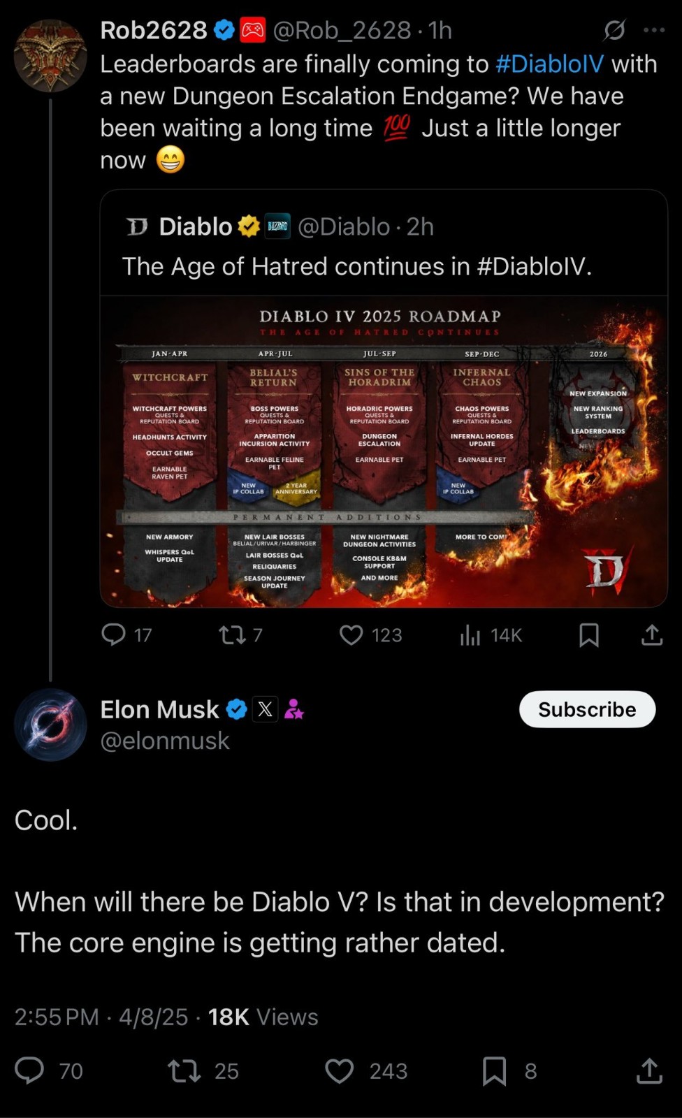 如果有人觉得《暗黑破坏神5》会很快面世,那可得打消这个念头了。暴雪暗黑大总管Rod Fergusson对《暗黑破坏神4》有着十年的超长规划。 在The Game File的连环采访中,《英雄联盟》工作室Riot Games的联合创始人Mark Merril问了Fergusson一个关于《暗黑破坏神4》未来规划的问题。Mark说:“你是如何考虑《暗黑破坏神》系列的下一个重大转折点和新篇章的?因为这是一个有着深厚底蕴和持久生命力的系列。” 这个问题最近一直萦绕在我们心头,罗德是这样回答的: “我们这是要玩长线。最近一直在搞长远规划。我已经制定了一份路线图——一份十年的路线图(a 10-year roadmap)……实际上是十二年——我能看到这个、那个,还有这些不同的计划,真的很振奋人心,也非常激动。我们就盯着玩家想要啥……具体就不多说了。” 暗黑4 2025年更新路线图 《暗黑破坏神》系列每部之间差不多隔个十年,所以这回答也不算意外。外媒想到了《魔兽世界》,记得暴雪当初觉得《魔兽世界》能活十年,结果现在早超了。个人觉着《暗黑破坏神4》未必能照这个路子走,但现在已经过去两年,如果暴雪想让玩家至少再坚持八年,还有很多工作要做。 此前,马斯克也曾发帖询问《暗黑破坏神5》,称其核心引擎太过时了。 |