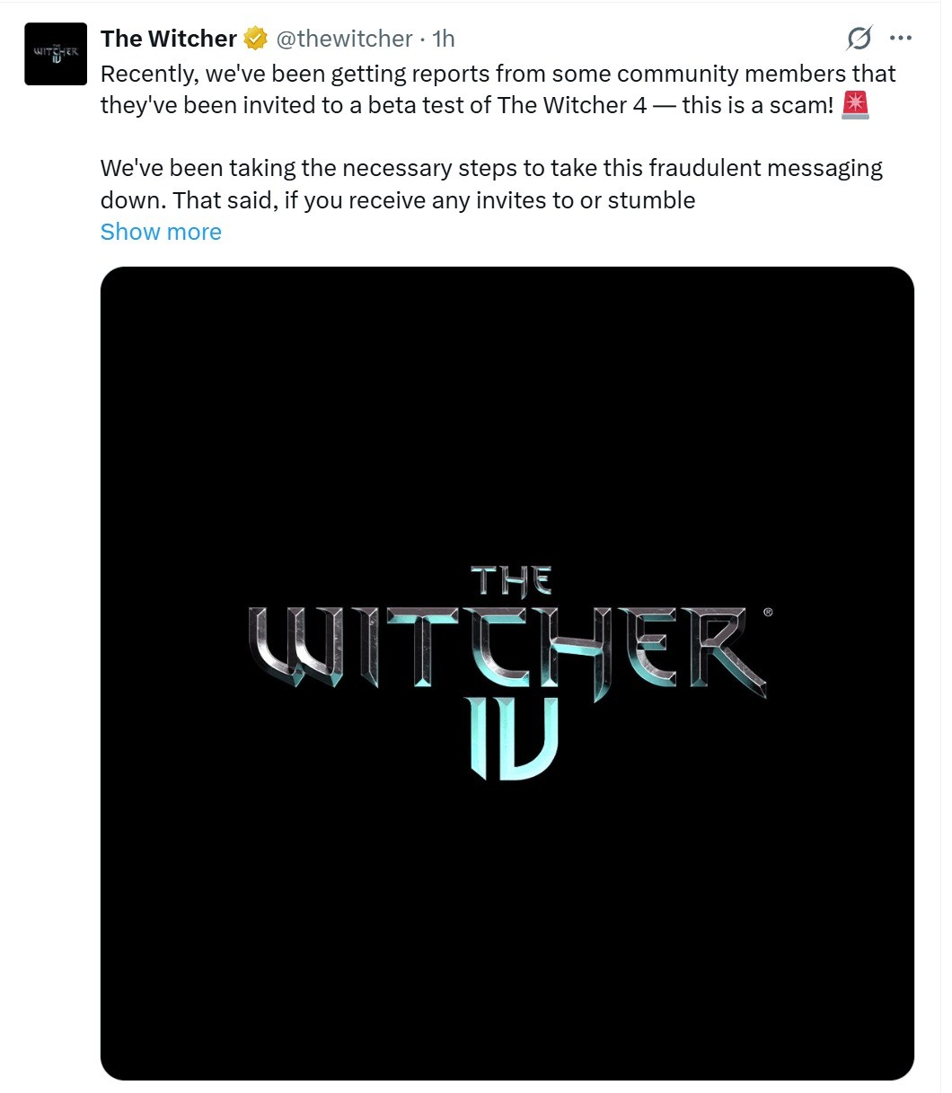 近日CDPR官方发推文警告玩家,网上出现的邀玩家参加《巫师4》Beta版测试的邀请函,是一个骗局。