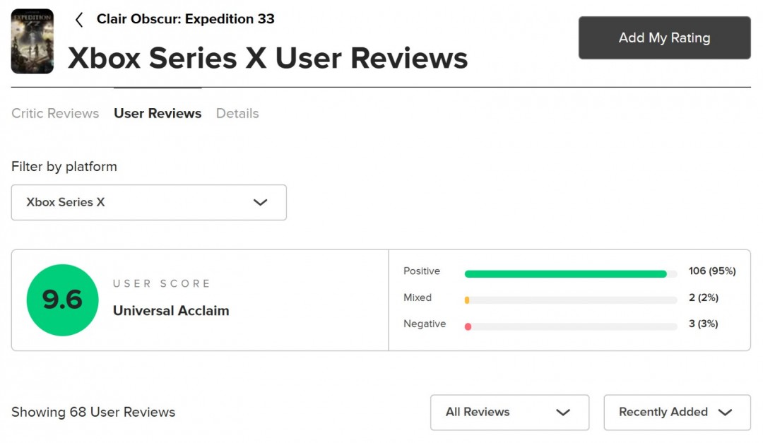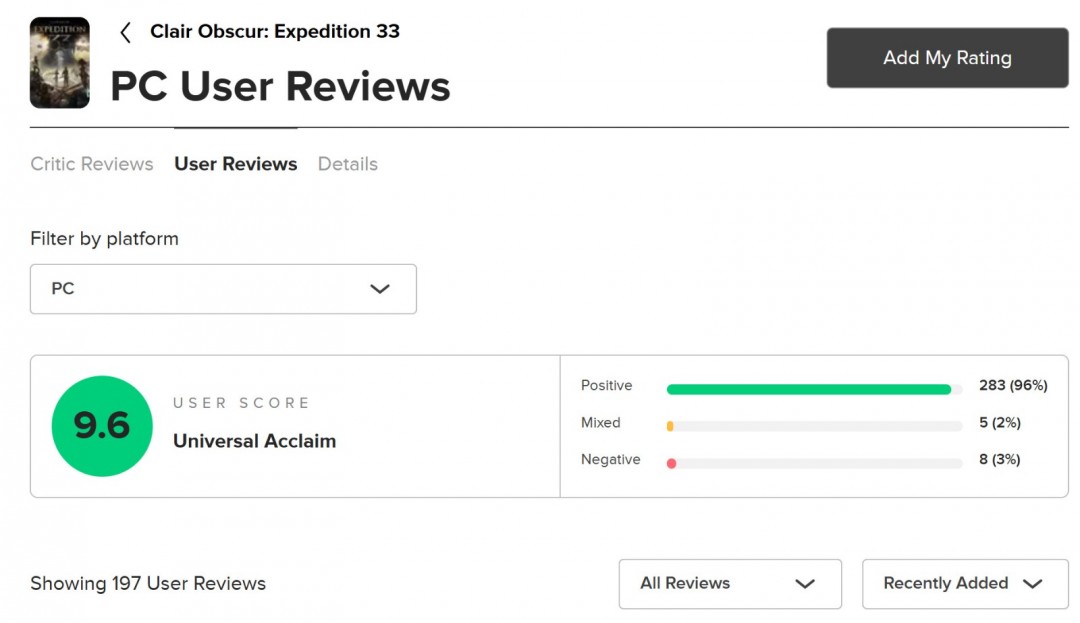 《光与影:33号远征队》M站用户评分接近完美:9.6分