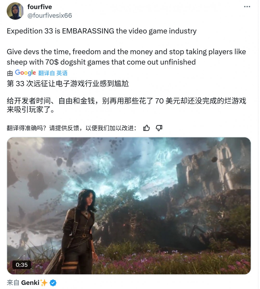 2025年是游戏惊喜连连的一年,像《双影奇境》和《天国:拯救2》这样的2A游戏让玩家们惊喜不已,销量甚至超过了耗资数亿美元的3A大作。最新加入这一行列的是《光与影:33号远征队》。 这款由法国新游戏工作室Sandfall Interactive开发的最新RPG,在游戏行业引起了不小的轰动。继成为2025年Metacritic上媒体评分最高的游戏之后,《光与影:33号远征队》的用户评分也近乎完美:9.6分,远高于其他好评游戏——《塞尔达传说:时之笛》(用户评分9.1)、《博德之门3》(用户评分9.2)和《巫师3:血与酒》(用户评分9.3)。 自发售以来,《光与影:33号远征队》的用户评分不断攀升,目前已有近800条评论(PS5版最多)。 一名打出满分10分的PC版玩家评论说:“尽管业内许多人仍在抱怨开发成本不断上涨,并为涨价辩护,但《光与影:33号远征队》却悄然证明了卓越的品质并不需要庞大的预算。这款游戏并非为了人为地延长游戏时间而打造庞大空旷的世界,而是专注于在每一个环节传递内容和灵魂。 它拥有我体验过的最精妙的回合制战斗系统,并配以引人入胜、令人欲罢不能的故事情节。从画面效果来看,它堪比顶级3A大作——对于一个仅有30名开发者的团队来说,这无疑是一项非凡的成就。《33号远征队》是才华与远见的结晶,也清晰地提醒我们,成就伟大的是热情,而非过度。” 另外一个给出满分10分的用户留言道:“这款游戏简直太棒了!它拥有令人惊叹的画面,带来一场视觉盛宴,让你沉浸在游戏世界中。故事情节扣人心弦,跌宕起伏。音乐也同样出色,增强了每个场景的情感冲击力,为整体体验增添了层次感。音效同样令人印象深刻,增强了真实感和沉浸感。游戏的世界构建一丝不苟,每个角落都注重细节,使其如同一幅栩栩如生、栩栩如生的画作。” 不过也有玩家指出,PC版的优化有点问题,即便开启DLAA,仍然有闪烁,特别是人物的面部。 X上也有用户指出《33号远征队》让整个3A游戏行业感到“尴尬”: |