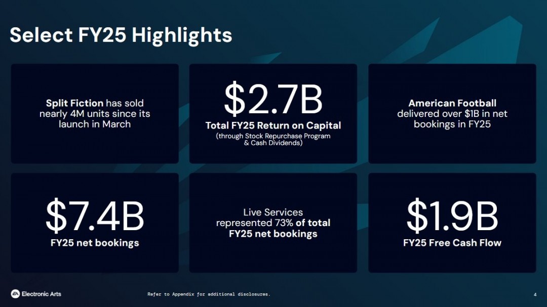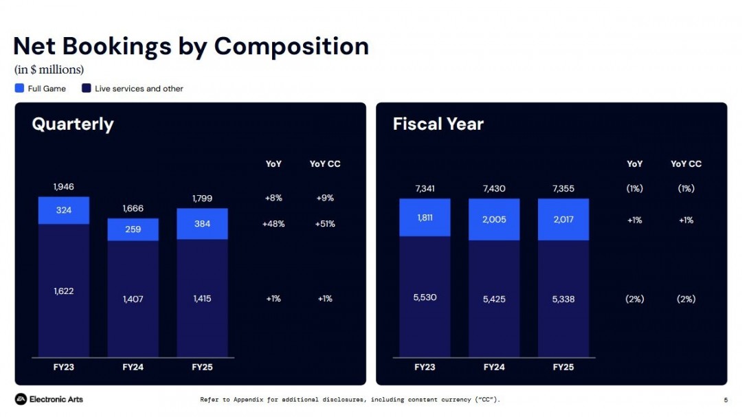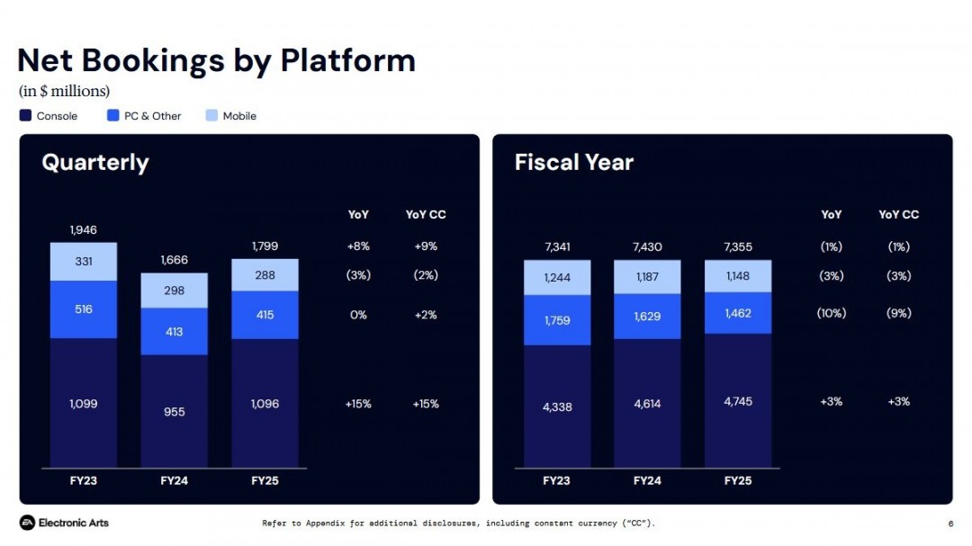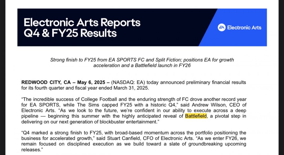 EA宣布新《战地》游戏将在2026年4月前发售,全面公开将于今年夏季揭露。 在公司财报业绩会议上,EA CEO Andrew Wilson将新《战地》描述为“打造我们下一世代娱乐大作的关键一步”。 从3月起,新《战地》进入封闭测试,尽管参与者被要求保密,但大量游戏画面仍不可避免地泄露到网上。 在X上发布的最新更新中,DICE表示新《战地》将于本月扩大测试规模,邀请更多来自欧洲、北美和亚洲的注册玩家参与。 EA 2025财年(2024年4月-2025年3月)财报数据: EA Sports预定值创下历史记录,美式橄榄球(American Football)预定值超过10亿美元 《双影奇境》,大获成功,销量达到400万套 年度营收略微下滑,来到75亿美元,即时服务占比73% 营业利润持平于15.2亿美元 EA 2026财年(2025年4月-2026年3月)发售计划: 第一季度(4月-6月): 《F1 25》(5.30) 第二季度(7月-9月): 《大学橄榄球26》 《Madden 26》 《NHL 26》 《FC 26》 其他时间: 《滑板》 《战地》 可能还有一个合作伙伴游戏 《战地》实验室即将开启亚洲地区首轮测试 EA旗下经典FPS系列《战地风云》正式宣布,其「战地实验室」项目将于5月启动测试。这个被誉为"系列史上最大规模社区共创计划"的项目,将在欧洲和北美邀请更多玩家,并开始包含部分亚洲地区的玩家,报名于5月6日开启。 今年年初,战地风云发布了《战地风云》实验室的实机演示,本次《战地风云》实验室的主旨是让社区玩家在《战地风云》的未来中发挥关键作用,即加入《战地风云》实验室直接参与游戏的测试阶段,本次测试几乎涵盖所有《战地风云》内容,玩家将在保密协议下体验仍在打磨的各个不同部分的内容。 《战地风云》实验室报名链接>>> 由4家全球工作室组成的开发团队在过去已经进行数轮内部测试,但现阶段更希望通过玩家的反馈,找出游戏在机制、平衡与玩法体验之间的最佳平衡点,本次测试将挑选来自不同背景的玩家,涵盖新手与资深老玩家,以确保游戏测试数据的多样性;“征服”与“突破”两种经典模式将会出现在测试中,并且兵种回归至突击、工程、支援和侦查四大本源定位。 在与核心玩家进行的四次初步的游戏中,帮助战地风云成功验证了以下几个方面: ● 为流畅、低延迟和高性能的枪战奠定坚实基础。 ● 作为战斗节奏调整计划的重要环节,在移动速度上找到适当的平衡,以实现蹲伏冲刺、战斗翻滚和翻越等功能。 ● 利用破坏机制在每个回合和体验中创造有趣且持久的战术玩法。 在测试新内容的同时,战地风云实验室还将继续对最初的重点领域进行改进,例如平衡不同的武器类型和伤害值,以及移动和战斗节奏机制。 破坏系统也仍然是游戏测试过程中的一个持续性话题。战地风云实验室将继续在各种地图上测试可破坏物体,并微调物体表面的损坏程度。 财报数据: |