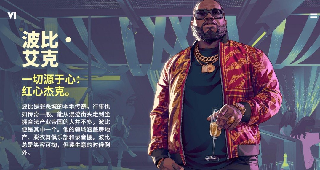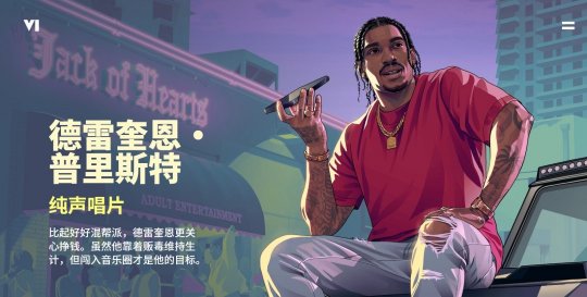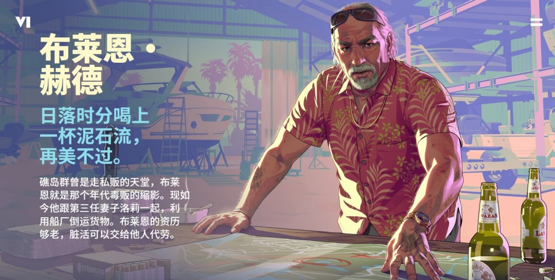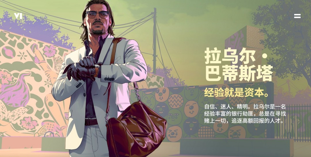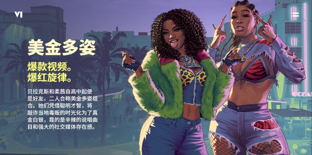 《GTA6》简体中文官网上线(昨晚R星公布第二支预告的时候简体中文官网一直显示Access Denied),发布了海量讯息。 8大人物: 杰森·杜瓦 露西娅·卡米诺斯 卡尔·汉普顿 波比·艾克 德雷奎恩·普里斯特 美金多姿 拉乌尔·巴蒂斯塔 布莱恩·赫德 6大地点: 罪恶城 雷奥奈达礁岛群 大草泽 盖尔霍恩港 安柏西亚 卡拉加山 官方中文预告(繁中): 美国罪恶城 杰森和露西娅心里一直清楚,命运对他们不公。本应简单的行动出了差错,美国阳光最灿烂的地方向两人展露出它最阴暗的一面,将他们卷入一场横跨雷奥奈达的犯罪阴谋。若想活着逃出生天,他们比以往任何时候都更需要彼此依靠。 体验《GTA》系列目前为止最宏大、最能带来沉浸感的关键革新。 杰森·杜瓦 杰森想过上轻松日子,可生活却越来越艰难。 杰森从小就与骗子和小偷为伍。他曾短暂参军,希望洗去少年时期不堪的过往。煺伍后,他在各个礁岛间做起了自己最擅长的活计:替毒贩跑腿。或许,做出改变的时候到了。 要是情况不对,转头叫我就好。又一天快活日子,对吧? 遇见露西娅,可能是他这辈子的万幸,又或者是不幸。杰森清楚自己想要的结果,但此刻,他有些彷徨。 露西娅·卡米诺斯 露西娅刚会走路,她的父亲就教会了她打架。 此后,生活与她便成了擂台上的对手。为了家人,她进了雷奥奈达监狱,却又阴差阳错得以获释。露西娅从中吸取了教训,接下来,每一步都得精打细算。 刚出狱,露西娅就准备改变命运。无论付出什么代价,她都准备坚持自己的计划。 与杰森一起展开新生活或许是她最好的选择。 只在雷奥奈达遇得上 当夕阳西下,霓虹灯亮起,每个人都有自己的抱负,也有要承受的代价。 卡尔·汉普顿 万一网上说的都是真的呢? 卡尔是杰森的朋友,跟着布莱恩干活。卡尔觉得最有安全感的事就是宅在家里,喝着啤酒,偷听海岸警卫队的通讯,用无痕模式逛逛网页。 疯子当道。习惯就好。 卡尔身处美国的底层社会,不过他乐在其中,偶尔有点偏执,喜欢有人陪伴。但他的朋友杰森却有更远大的抱负。 探索罪恶城 一切,无限放大虽然早已不是 80 年代,但罪恶城依旧是美国的阳光与狂欢之都。美国的魅力、忙碌和贪婪都浓缩在一座城市里。从大洋海滩柔软洁白的沙滩与粉彩装饰艺术酒店,到小古巴的街头面包店与蒂莎沃卡跳蚤市场上的假货山,再到全球邮轮中心罪恶城港口,每一个街区都各有风味。 波比·艾克 一切源于心:红心杰克。 波比是罪恶城的本地传奇,行事也如传奇一般。能从混迹街头走到坐拥合法产业帝国的人并不多,波比便是其中一个。他的疆域涵盖房地产、脱衣舞俱乐部和录音棚。波比总是笑容可掬,但谈生意的时候例外。 顶级金曲。 波比看似只为自己打算,但他最看重的,其实是在纯声唱片这件事上,与年轻有为的音乐人德雷奎恩形成的合作关系。现在他们只缺打响名头的那一曲。 探索雷奥奈达礁岛群 天堂入口 着装随意,酒吧林立。这片热带群岛的生活不算奢华,但惬意十足,最适合搬出沙滩椅,喝到微醺。但要记住,面前的这片蔚蓝,是美国最美丽也最危险的海域。 德雷奎恩·普里斯特 纯声唱片 比起好好混帮派,德雷奎恩更关心挣钱。虽然他靠着贩毒维持生计,但闯入音乐圈才是他的目标。 现在你是我们厂牌的人了。 如今,德雷奎恩已签约美金多姿,他在波比的脱衣舞俱乐部安排演出的日子或许不多了,因为他的目光,已经锁定了罪恶城的舞台。 探索大草泽 欢迎来到湿地 雷奥奈达皇冠上那颗无法驯服的宝石。在这片原始广袤的土地下,谁也猜不到会藏着什么。有人说短吻鳄最值得一看,但红树林之间,还潜伏着更致命的捕食者和更怪诞的发现。 美金多姿 爆款视频。爆红旋律。 贝拉克斯和柔茜自高中起便是好友,二人合称美金多姿组合。她们凭借聪明才智,将敲诈当地毒贩的时光化为了真金白银,靠的是辛辣的说唱曲目和强大的社交媒体存在感。 成名,只有一首歌的距离。 美金多姿生涯早期与当地说唱歌手“D调”合作的热门单曲曾让她们名噪一时。如今,五年过去,历经艰难险阻,二人终于与纯声唱片签约,希望好运能再次降临。 探索盖尔霍恩港 生活不易雷奥奈达被遗忘的海岸线。廉价的汽车旅馆、荒废的景点和空荡荡的购物中心恐怕再也不会被游客心仪,但新的经济模式正在这个曾经繁华的度假胜地崛起。这里的硬通货是廉价酒、止痛药,还有卡车停靠站里的能量饮料。跨上越野摩托的时候,记得护好钱包。 拉乌尔·巴蒂斯塔 经验就是资本。 自信、迷人、精明。拉乌尔是一名经验丰富的银行劫匪,总是在寻找赌上一切,追逐高额回报的人才。 行家,懂得随机应变。 拉乌尔的鲁莽让每次行动的风险直线上升。他的团队迟早得做出选择:要么加倍下注,要么抽身离场。 探索安柏西亚 让雷奥奈达 有糖吃 雷奥奈达的健康与繁荣之战在此打响。在雷奥奈达的心脏地带,美国工业与老派价值观依旧占据主导,无论代价几何。联合结晶糖类精炼厂提供了就业机会,而当地的摩托帮则挑起了满足其它需求的大梁。 布莱恩·赫德 日落时分喝上一杯泥石流,再美不过。 礁岛群曾是走私贩的天堂,布莱恩就是那个年代毒贩的缩影。现如今他跟第三任妻子洛莉一起,利用船厂倒运货物。布莱恩的资历够老,脏活可以交给他人代劳。 看似是雷奥奈达海滩上的闲人,办起事来则如大白鲨般迅勐。 布莱