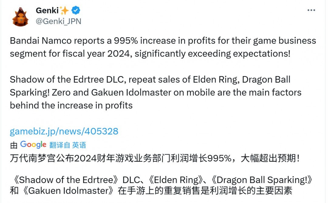 万代南梦宫刚刚发布了截至2025年3月的财年财务报告。这家日本发行商取得了非常亮眼的业绩,超过了预期。 万代南梦宫游戏业务部门实现了创纪录的利润,大幅增长995%,达到4.75亿美元,比预期高了2.67亿美元。 财务报告还显示,净销售额同比增长22.3%,达到31.6亿美元,远超预测的25.7亿美元。 万代南梦宫的收入主要来自主机游戏的销售,主机游戏的销售比去年增长了42.6%。这一切要感谢FromSoftware的DLC《艾尔登法环:黄金树幽影》,作为一个付费资料片,表现非常出色。 然后是暌违18年的《七龙珠 电光炸裂!ZERO》也取得了巨大成功。该作在不到一年的时间内全球销量已达540万份,作为一个格斗游戏,这已经是一个很不错的表现了。 此外,万代的即时服务部门也小幅增长了3.5%。 由于除了《艾尔登法环:黑夜君临》之外,该公司没有其他大型3A大作的发行计划,因此未来一年的收入可能会下降。该公司预计销售额将同比下降14.4%,运营成本将下降41.6%。 |
