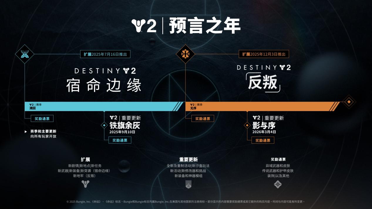 今天,Bungie在所有平台发布了命运系列的最新扩展——《命运2:宿命边缘》。《宿命边缘》是《命运2》年八“预言之年”的首个DLC,也是全新命运传奇——宿命传奇的第一章。守护者将勇闯未知,而宇宙的奥秘,还有玖,在等待着我们。? 在《宿命边缘》中,玖将在命运的新纪元扮演关键角色。它们早在旅行者出现在太阳系之前就已存在,并且及其强大,而我们将了解到,正是由于它们的存在,才造就了我们如今所知的世界。多年以来我们置身事外,现在是时候直面这些久被遗忘、不可知的神明。守护者们将深入太阳系深处的隐秘角落,回应召唤,前往一颗被暗物质笼罩并受奇点侵扰的小行星——开普勒。它将撼动他们对现实的认知…? 新目的地:开普勒 《宿命边缘》以开普勒为背景,这是一个全新的目的地,其灵感来自《命运2》地牢和目的地的解谜和寻路挑战,鼓励玩家进行深度探索、揭秘并主导发现。全新敌人、武器、装备以及目的地专属技能,等待勇于探索其秘密的玩家。 开普勒的一大特色是其丰富的暗物质能量,守护者可以运用这些能量来施展目的地技能。通过全新技能物质火花,守护者将可以联于暗物质并改变形态,使其能够挤过狭窄空间,在各种地形上跳跃和冲刺,从而成为一股强大的毁灭之力。 其他技能包括全新重定位器炮台,它使用堕落者暗物质技术将玩家传送至不同环境;以及物质变形,守护者可结合暗物质和缚丝的力量来操控周围环境。 欢迎来到门户 除了7月16日推出的《宿命边缘》扩展外,《命运2》还推出多项重要的核心游戏创新,面向所有玩家开放。其中一项主要创新为全新简化的活动选择界面——门户,它将提供一系列根据不同游戏风格定制的活动,让玩家能够轻松找到下一个冒险。 玩家可以轻松选择火力战队行动、巅峰行动、熔炉竞技场行动以及全新推出的单人行动。火力战队行动和巅峰行动强化了快速火力战队行动和较长形式的合作内容,而全新单人行动则专为那些想要进行进行短暂、快速的10分钟冒险的单人玩家而设计,无需进行组队! 此外,玩家可以根据自己喜欢的玩法和追求的特定奖励来定制活动。50个全新修改器将能提供更深入的游戏定制,并为玩家带来更大的挑战,而活动轮换将确保玩家始终有新的目标。 护甲3.0和阶段体系 随着《宿命边缘》的发布,新推出的所有护甲都将使用护甲3.0版系统。已有护甲的特性不会改变,其属性将按1:1的比例转换。 全新护甲3.0系统将推出全新系统,提升游戏风格。例如可以提升武器伤害的属性,以及强化已知属性的效果。你只需将属性提升至200点即可获得。如果你同时穿戴两件或以上同款套装,还能获得特殊套装奖励,来进一步提升你心仪的配装。 此外,武器和护甲还将有全新的阶段体系。五个新阶段的每个阶段都提供更合理的属性分配、特性和更多奖励机制。为了获得最高阶段的最佳装备,你必须参与最具挑战性的活动。你获得的高阶段装备越好,你就能应对更具挑战性的内容。 新突袭,世界首通赛将于7月20日举行 《宿命边缘》发布后不久,Bungie将解锁最新突袭——永恒沙漠。《命运》突袭是为六个技巧娴熟的守护者量身定做的巅峰活动,不仅考验这些守护者的战斗能力,还有配合、思维以及解决困难挑战的能力。 永恒沙漠将于北京时间7月20日凌晨1点面向所有《宿命边缘》玩家发布。随着突袭的发布,Bungie还将开启世界首通赛,为世界上第一个完成突袭的火力战队提供奖励。确认获得胜利的火力战队成员将获得专属的世界首通腰带以及世界首通称号。在突袭发布后的几天内,请留意获胜的世界首通战队的官方公告。 预言之年路线图 从年八“预言之年”开始,《命运2》每年将推出四项主要内容:两个付费扩展和两个面向所有玩家开放的重大更新。这些重大更新将包括新活动、异域任务、新装备和奖励(包括异域武器)等。最棒的是,这种新结构无需付费即可参与赛季活动,这样所有玩家都能体验不断发展的游戏世界。查看下方预言之年路线图的所有内容。 《命运2》扩展开放权限 从7月9日开始至7月23日,除《宿命边缘》外,所有当前可用的《命运2》扩展在所有支持的平台(PlayStation、Xbox、Steam、Microsoft Store、Epic Games Store)免费开放。锦上添花的是:在开放权限期间获得的所有货币、装备、称号、成就和装饰都可以保留。 |