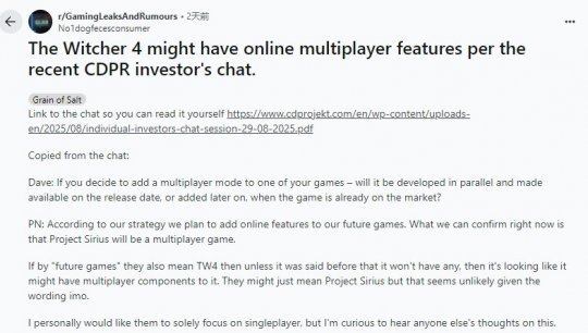 近日CDPR官方发布了投资者聊天会纪要文件,CDPR首席财务官Piotr Nielubowicz等人参与了聊天会,他们聊了聊公司正在开发的新作。 投资者Dave询问:“如果你们决定为某款游戏添加多人模式,它是会与游戏本体同步开发并在发售日上线,还是会等游戏上市后通过更新追加?” Nielubowicz回答称:“根据我们的战略,未来作品将逐步加入在线功能。目前我们可以确定的是,《巫师:天狼星计划》(Project Sirius)是一款多人游戏。” Reddit网友认为:“如果‘未来的游戏’也包括《巫师4》,那除非此前明确表示《巫师4》不会有多人内容,否则从目前情况来看,该作很可能会有多人玩法。在我看来,他们口中的未来游戏不太可能仅指天狼星计划,毕竟措辞并非如此局限。” 就我个人而言,更希望他们能全身心投入到单人模式的开发中,但我也很好奇其他人对此有什么看法。 |