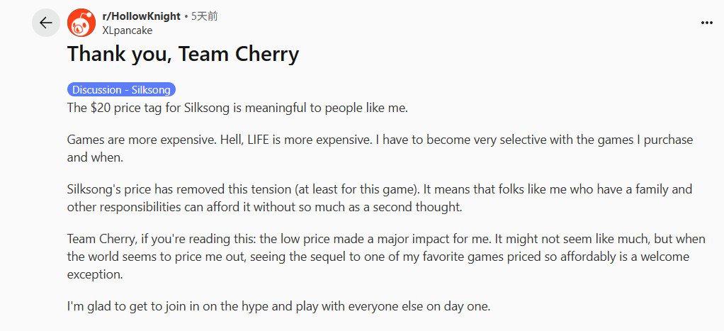 《空洞骑士:丝之歌》定价20美元 粉丝认为太低要求涨价
