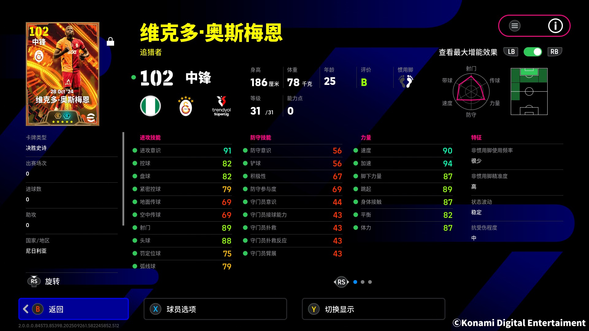 他是伊斯坦布尔的崭新利刃 疾速突袭撕裂对手防线 暴力头槌轰开胜利之门 从亚平宁金靴到土耳其新王 他的锋芒,注定无处可藏! 双增能决胜史诗 维克多·奥斯梅恩即将登场! 更多活动详情一起来看看吧! — 活动一览 — 非洲雄鹰 累抽必得 赛末冲刺 登录有礼 英格兰联赛 巡回赛 双红会 赛事助威 精选球员 阵容召集挑战 —活动详情 — 非洲雄鹰 累抽必得 双增能决胜史诗 维克多·奥斯梅恩将通过【非洲雄鹰 累抽必得】登场!想要补强球队的玩家们千万不要错过本次活动! *活动期间定向球员抽取概率将随抽取次数的增加而提升;当达到指定抽取次数时,必定获得卡池内的定向球员。 维克多·奥斯梅恩 他是席卷绿茵的黑色旋风,从尼日利亚的街头少年到备受豪门瞩目的“亿元先生”,他用信念与坚韧改写命运!球场上的奥斯梅恩有着敏锐的门前嗅觉、猎豹般的爆发、精湛的射术以及强劲的头球能力,这让他成为当代足坛最具威胁的锋线杀手之一!即便远离五大联赛,他依旧用进球向世界证明他主宰赛场的能力! 2024-2025赛季,租借加盟加拉塔萨雷的奥斯梅恩,将伊斯坦布尔变成了自己的狩猎场。土耳其联赛第10轮,他在定位球战术中与队友配合默契,高高跃起头槌破门,帮助球队扩大领先优势!整个赛季他势不可挡,不仅以联赛射手王身份率队夺得联赛冠军,还在国内杯赛决赛上独中两元,帮助球队加冕国内“双冠王”伟业!赛季结束后,加拉塔萨雷豪掷7500万欧元的转会费,将这位尼日利亚锋霸正式收入麾下,他在这片赛场的传奇之路,才刚刚开始! *增能后球员总评可达102分,上阵最大总评可达106分 维克多·奥斯梅恩拥有【全面提升】的增能加成,在阵中拥有同联赛的球员越多,增能属性越强,最高能够拥有【属性+3】加成。 奥斯梅恩自带【炮弹式头球】特殊技能,搭配89分跳起和88分头球,他在禁区内高高跃起,将球重重砸入对手球门! *详情活动规则请以游戏内活动公告为准 活动时间: 2025/10/13 11:00 ~ 2025/10/20 11:00 赛末冲刺 登录有礼 【赛末冲刺 登录有礼】活动期间,每日登录游戏即可获得【金币】、【随机技巧代币】等道具奖励! *详情活动规则请以游戏内活动公告为准 活动时间: 2025/10/13 11:00 ~ 2025/10/24 11:00 英格兰联赛 巡回赛 参与【英格兰联赛 巡回赛】活动,你将迎战各路豪强,通过完成比赛可以积累一定数量的巡回赛积分,达到一定的积分,可以获得【2025公测S4赛季免费签约】等奖励。 *详情活动规则请以游戏内活动公告为准 活动时间: 2025/10/13 11:00 ~ 2025/10/20 11:00 双红会 赛事助威 在【双红会 赛事助威】活动中,玩家可以从【利物浦 红 VS 曼联】赛事中选择你助威的球队,参与投票即可获得【经验值代币】,预测成功将获得【随机技巧训练代币】。 *详情活动规则请以游戏内活动公告为准 ? 【双红会 赛事助威】预测时间: 2025/10/13 11:00 ~ 2025/10/19 11:00 发奖时间: 2025/10/24 11:00 精选球员 阵容召集挑战 在【精选球员 阵容召集挑战】活动期间,玩家通过召集相应的球员完成任务,即可签下特定的精选球员!完成任务时,将回收召集所提交的球员。 *详情活动规则请以游戏内活动公告为准 ? 活动时间: 2025/10/13 11:00 ~ 2025/10/31 11:00 |