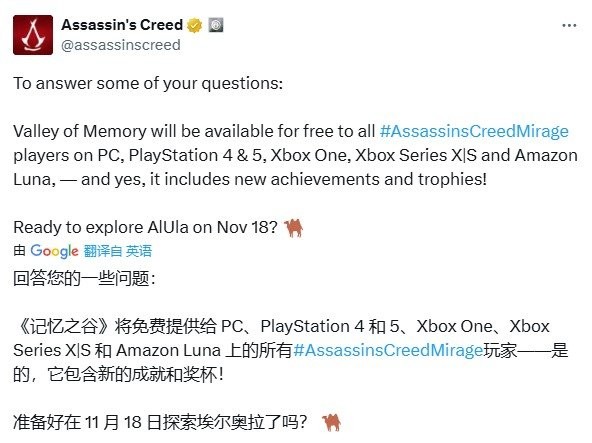 育碧官方今日正式宣布,《刺客信条:幻景》将于11月18日正式上线的免费大型更新“回忆山谷”,将为所有玩家带来全新的成就与奖杯。 据悉,“回忆山谷”DLC将免费提供给所有在PC、PlayStation 4、PlayStation 5、Xbox One、Xbox Series X|S以及Amazon Luna平台拥有《刺客信条:幻景》的玩家。此次更新的核心内容是带领玩家前往一个全新的地区“埃尔奥拉”,并在此展开一段围绕主角巴辛姆的新剧情线。 除了新增的地图和故事,此次更新更注重游戏体验的全面提升。官方透露,更新将包含多项玩法改进与调整,其中包括: 更流畅的跑酷与机动性:对跑酷系统进行优化,使角色的移动更加顺畅自然。 ANIMUS序列任务重玩功能:允许玩家重新体验已完成的特定任务序列,为追求完美或希望回味经典片段的玩家提供了便利。 “回忆山谷”不仅是《刺客信条:幻景》的内容扩展,更是对游戏本体体验的一次重要完善。此次免费更新展现了开发团队对玩家社区的持续支持,备受玩家期待。 |