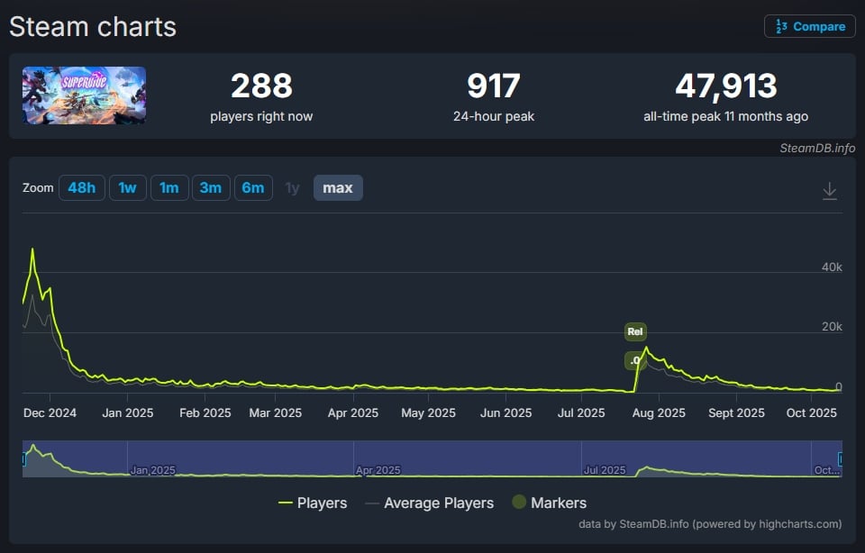 Theorycraft Games工作室开发,网易负责代理发行,免费MOBA大逃杀《头号追击》近期面临玩家数量大幅减少的不利境况,不过在外媒的采访中Theorycraft Games工作室高层表示,即使玩家数锐减也不会关服。 《头号追击SUPERVIVE》是一款具有霓虹末日风格的英雄大逃杀游戏 空降进入这款即兴动作沙盒游戏,它将策略性的火爆枪战元素与划时代的风暴追猎手体验相结合。成为人气小队,尽情彰显你的存在感吧。 《头号追击》于2024年11月开启了抢先体验,作为曾经参与开发了《英雄联盟》、《无畏契约》等游戏的资深开发者主导开发,游戏一经推出备受瞩目,有多达100万以上的玩家参与了测试,正式版2025年7月推出,长期维持非常好评。 ·工作室的创意总监Jessica Nam日前接受采访,承认了目前游戏处于很不利的状况,不过工作室仍然会坚持更新,维持游戏的免费策略以及长期运营。 |
