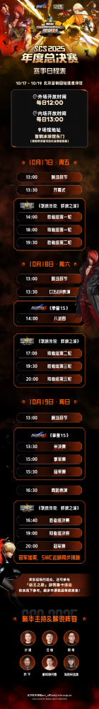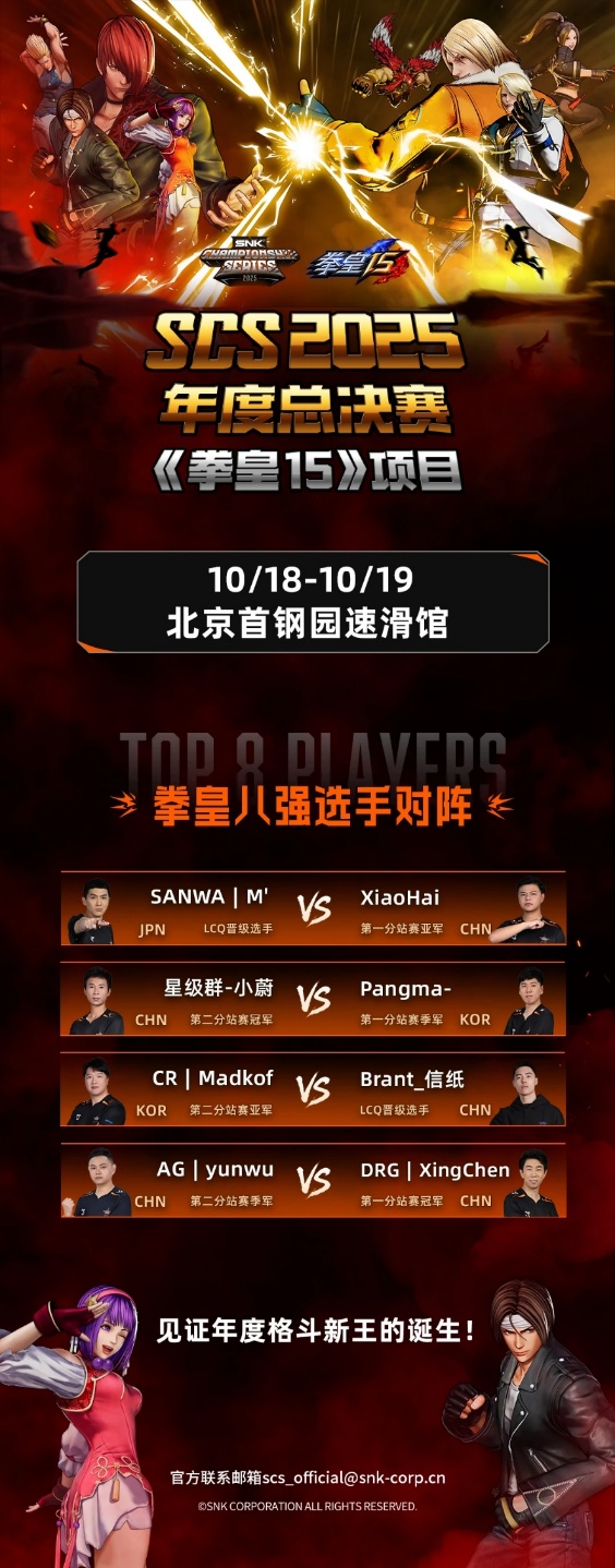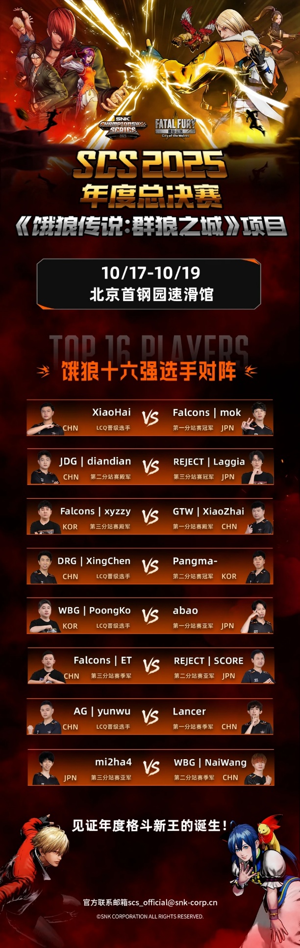 由株式会社SNK主办的SCS 2025(SNK冠军系列赛 2025)年度总决赛,将于10月17日至19日在北京首钢园举行。届时,将诞生《拳皇15》《饿狼传说:群狼之城》两大项目年度总冠军,并揭晓SWC 2025直通人选。 本届SCS赛事总奖金高达100万元。自5月开赛以来,吸引了海内外众多格斗玩家参与。经过线上预选赛、线下分站赛多轮选拔,最终共有8位《拳皇15》选手和16位《饿狼传说:群狼之城》选手晋级本次年度总决赛。他们将在为期三天的比赛中展开激烈角逐,为全球格斗爱好者带来高水平的竞技盛宴。 参赛选手名单 《拳皇15》项目:XingChen、XiaoHai、Pangma、小蔚、Madkof、yunwu、信纸、M’。首轮对阵如下: 《饿狼传说:群狼之城》项目:mok、abao、Lancer、XiaoZhai、Pangma、Score、NaiWang、diandian、Laggia、mi2ha4、ET、xyzzy、XiaoHai、yunwu、PoongKo、XingChen。首轮对阵如下: 赛程安排 除对战比赛、场间互动之外,总决赛现场还特别打造了以“新王诞生之路”为主题的沉浸式文化街区,设有水友赛、街机试玩、Coser合影、痛车展览等游园项目。赢取SNK轻周边、手办、耳机、摇杆等奖品的同时,玩家们能进一步感受SNK经典格斗的乐趣与魅力。 赛事期间,线上观众可通过B站、抖音、快手、斗鱼、虎牙、视频号等官方直播平台同步观看,第一时间见证总冠军诞生现场。参与直播间互动,还有机会获得更多精美好礼。 战火将启,荣耀在即!10月17日至19日,北京首钢园,让我们一起期待SCS 2025格斗新王的加冕时刻! 活动时间:10月17日至19日,每日12:00外场开放,13:00观众入馆 活动地点:北京石景山区首钢园速滑馆(可定位至首钢冰球馆东门,按标识指引前往) |