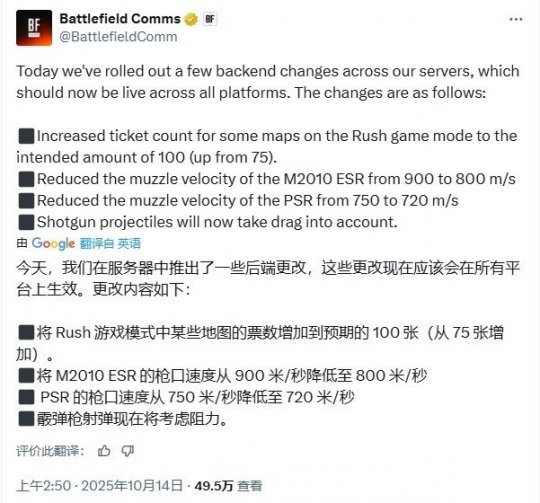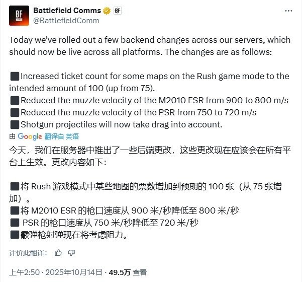 在数月前创下测试纪录后,《战地6》终于全面发售,目前已迅速登顶多国销量榜单。EA面向《战地6》发布服务器端更新,对游戏特定内容进行后台调整,包含武器平衡改动。 通过Battlefield Comms官方社交媒体渠道发布的公告显示,《战地6》已实施无需玩家下载的后端更新。与传统补丁相比,本次调整内容较为精简,其中重要改动是将热门模式「突袭」的票数从75提升至100。 除模式调整外,本次更新还涉及多款武器平衡性修正。所有霰弹枪子弹现均受空气阻力影响,以杜绝玩家在超远距离使用(该类武器设计初衷为近战交战)。M2010 ESR与PSR狙击步枪的枪口初速亦被下调:M2010从900米/秒降至800米/秒,PSR则从750米/秒微调至720米/秒。 这些调整获得玩家普遍认可,但社区仍对某些核心问题存有争议。已有玩家开始罗列期望改进的功能要素——武器准星扩散机制(控制开枪时子弹散布的系统)正是争议焦点之一。众多社区成员呼吁EA削弱《战地6》的武器扩散效果,并上传了大量瞄准敌人后子弹未命中或随机偏离的实机片段。值得玩味的是,《战地2042》也曾出现类似问题,最终由DICE团队完成修正。 凭借玩家口口相传与媒体一致好评,《战地6》有望成为该系列史上最成功的首发作品之一。发售仅数日,《战地6》即已跻身销量榜首,首发当日Steam单平台收入突破一亿美元。然而EA并未因火爆开局而松懈,发行商与旗下开发团队正持续优化玩家体验。 |