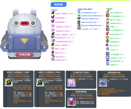 经典端游《冒险岛》每年10月的保留节目——夜晚的马戏团又双叒来啦!这次休彼得蔓大手一挥,赞助地球防御本部一起举办庆典活动~不仅内容有趣,奖励也极其丰厚!还有万圣节专属的次元鬼屋任务和我的小屋(万圣节版)等你来参加哦~ 夜晚的地球防御本部庆典,冒险岛金刚S横空出世?! 10月15日起至11月25日,玩家可参与[夜晚的马戏团]夜晚的地球防御本部庆典任务,活动期间,休彼德蔓组建了冒险勇士副手队,不同颜色的队伍能力各异,消灭等级范围内怪物收集冒险勇士点数,支援冒险勇士的队员们吧。 每周要激活出动模式、设置获得奖励的模式(三选一),选择后该周无法更改。奖励每日最多领取1次,每周最多领取3次。 除主要活动之外,玩家们还将化身庆典设计师,设计师拥有装备庆典的力量,通过使用幻想币来强化冒险岛金刚S或装饰各种庆典饰品。 庆典设计师分为5个等级,达到<大师设计师>后,获得的设计师经验值全部兑换成幻想币,可通过休彼德拉获得。 冒险岛金刚S有2种专利许可技能,冒险岛金刚S:炼狱轰击技能与冒险岛金刚S:制空强击技能。构成冒险岛金刚S的部位共10种,各个部位都会帮助发动冒险岛金刚S的专利许可技能。最先激活头部和面具部位才能使其他部位准备驱动,进入可激活状态。头部部位激活后,胸部、腰部、左手拳和右手拳都会变成可激活的准备状态。面具部位激活后,左侧肩膀、右侧肩膀、左侧手臂、右侧手臂都会变成可激活的准备状态。各部位不同强化阶段的可分为0阶段、1阶段、3阶段、5阶段。 使用幻想币强化冒险岛金刚S,或装饰各种庆典饰品后,可以获得增益。 部分增益奖励需要在地球防御本部庆典现场找NPC淘气白外星人领取。 庆典小游戏一——升起的明星阿琳举办粉丝见面会 即日起至11月25日,参加[夜晚的马戏团]升起的明星阿琳举办粉丝见面会!活动,获得 阿琳的粉丝见面会普通席入场券,双击使用进入到粉丝见面演唱会现场,遇到粉丝俱乐部外星本部的应援团长白外星人,获得专门为阿琳研究WOTA艺,只要跟着做就能获得奖励! 在阿琳的粉丝见面会场地普通席与VIP席都可以购买纪念道具。 庆典小游戏二——虚拟训练系统启动! 即日起至11月25日,参加[夜晚的马戏团]虚拟训练系统启动!活动,休彼德蔓为了应对敌人入侵地球防御本部的庆典现场,进行虚拟系统训练,进入系统后,会随机指引击败目标。个人能够持有的激光弹夹和子弹有限,成功发射时发放分数,如向目标之外的对象发射,则回收分数。没有弹药或剩余时间时,将自动退出。获得的分数可以兑换成设计师经验值。 累积分数达到10000分时,可以获得虚拟训练大师椅子交换券。 庆典小游戏三——监视要员阿亮 10月29日起至11月25日,参加[夜晚的马戏团]监视要员阿亮活动,成为庆典现场的监视要员,抓出可疑人员,可疑人员进入瞄准器后保持2秒不离开范围,就会出现数值条,数值条填满的瞬间,特殊开发的驱除器启动,发射电波立即清除可疑人员。获得的分数可以兑换成设计师经验值。 累积分数达到20000分时,可以获得锁定目标!椅子交换券。 庆典小游戏四——冒险岛金刚S超频 10月29日起至11月25日,参加[夜晚的马戏团]冒险岛金刚S超频活动,消灭等级范围内怪物,收集补充能量的浓缩能量和急速冷却上涌热气的液氮,可以对冒险岛金刚S进行超频作业,升级冒险岛金刚S的炼狱轰击与制空强击技能的额外属性。 庆典小游戏五——守护庆典 10月29日起至11月25日,参加[夜晚的马戏团]阿哲的紧急呼叫活动,维护庆典现场的和平,消灭卡雄战甲吹泡泡鱼模式怪物,限时期间内通过对怪物造成的伤害获取分数,根据分数发放对应的经验值。*超过第10阶段,进入挑战极限的领域,消灭怪物后获得突破极限分数。 突破极限分数达到1000分,还能获得我们是冒险勇士!椅子交换券。 庆典小游戏六——练习胜利姿势 11月12日起至11月25日,参加[夜晚的马戏团]练习胜利姿势活动,阿海构思了让人记住冒险勇士存在的帅气姿势,跟着录像练习,点击对应的方向键完成胜利姿势,获得的分数可以兑换成设计师经验值。 累积分数达到20000分,还能获得有些奇怪的冒险勇士椅子交换券。 庆典小游戏七——介绍一下机器人朋友 11月12日起至11月25日,参加[夜晚的马戏团]怪物外星人章鱼枪和机器人朋友活动,帮助怪物外星章鱼枪和机器人朋友顺利定居地球防御本部。作为回报,每天可以从机器人朋友处获得一个随机礼物。快来试试今日运势如何吧! 装备附加属性传授: 马戏团特殊福利: 即日起至11月25日,随着活动的展开,每当设计师等级上升时,依次开放1个福利按钮,等级升级为大师级,可预约激活冒险岛金刚S项目纪念模式!在马戏团庆典结束2周内可以继续使用冒险岛金刚S技能。 完成隐藏任务可以获得:地球防御本部庆典照片卡。 超越成长秘药: 密特拉的极限能量石500万100%箱: 密特拉的星之力强化箱: 装备传授: 移动骑宠技能: 寻找异常!解决鬼屋的次元扭曲吧! 10月22日起至11月4日,玩家可参加次元鬼屋活动,受到次元门开启事件影响,鬼屋的次元扭曲了,寻找异常现象,解决鬼屋的次元扭曲,累积每日稳定化次数,获取各种奖励吧! 顺利逃出次元鬼屋,可以累积1次每日稳定化次数(每天仅可累积1次每日稳定化次数)。根据每日稳定化次数,可获得以下奖励。 万圣节专属我的小屋~今年依旧要保持惊悚可怕哟~ 10月18日起至10月31日,