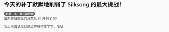 近期,有玩家发现在《空洞骑士:丝之歌》的最新补丁中,堪称最难挑战的“跳蚤溜溜”的最高记录被制作组偷偷地调低了。 《空洞骑士:丝之歌》为玩家准备了些棘手挑战,而其中最难的不是boss与无数的跳跳乐,而是在第三章跳蚤营地开启的“终末狂欢”中的三个跳蚤挑战。更痛苦的是,当你打败花王守护者“赛斯”,他会来到跳蚤营地并迅速在所有小游戏中创下离谱的高分纪录,虽然打败他的记录不会影响游戏100%进度,但想要他的忆痕则需要打败他并超越他在三个跳蚤挑战中的记录。 但赛斯的记录过于离谱,不少玩家在跳蚤溜溜中屡屡受挫,始终无法突破塞斯95分的恐怖成绩。值得庆幸的是,对于始终差之毫厘的玩家们,开发团队似乎也意识到这个要求过于严苛。根据红迪用户的最新发现,在游戏最新补丁中,塞斯在跳蚤闪避中的纪录已从95分悄然降至90分。这虽然仍是不低的门槛,但微调后已有大量玩家成功达标。有些曾以毫厘之差失败的玩家甚至无需再次尝试,系统直接认可了他们之前的成绩。 如果,你也受这个挑战折磨的死去活来,不妨现在去试试,说不定这5分之差就是你成功挑战的关键。 |