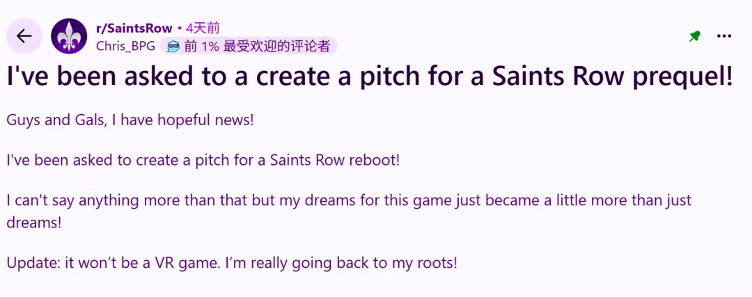 《黑道圣徒》最新一作《黑道圣徒:重启版》于2022年推出,就是一坨,角色设计非常DEI,非常“正确”。果不其然,重启版口碑翻车,销量也很差劲。重启版绝不是粉丝想要的,但现在该系列的粉丝或许可以期待一个前传。 《黑道圣徒1》总监Chris Stockman透露,自己被发行商Embracer要求为《黑道圣徒》前传制作一个提案。早在之前,Chris Stockman就展示了携带原班人马回归该系列的意图,现在这个愿望似乎要成真了。 Chris Stockman首先在Reddit上分享了这一消息,同时他还特别提到新作并非VR游戏,非常期待能回归。 Chris Stockman在《黑道圣徒1》刚发售就离开了开发商Volition,成立了自己的工作室,专注于VR游戏。但Chris Stockman在Reddit上的贴文已经强调,《黑道圣徒》前传非VR游戏,而是一款完整的主机作品。 随着《黑道圣徒:重启版》的失败,《黑道圣徒》原班人马打造的前传游戏或许可以挽救这个系列? |