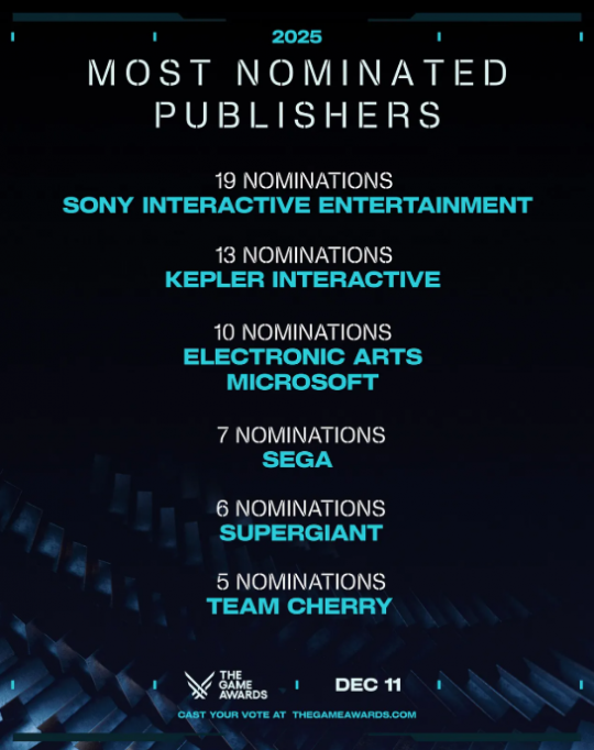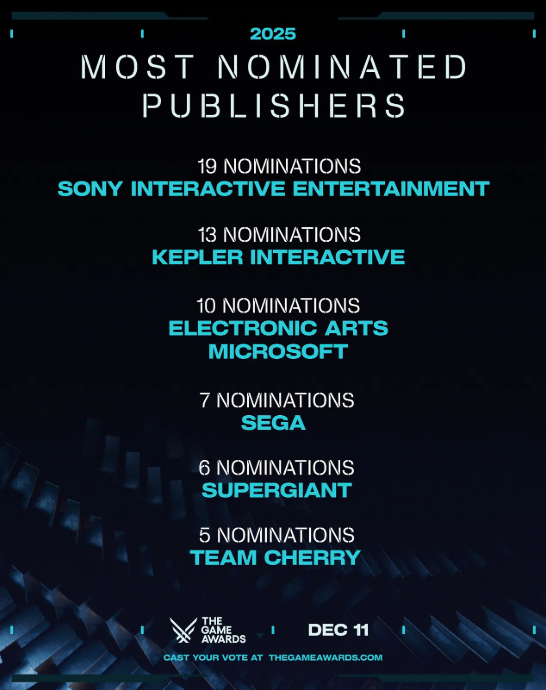 作为自1994年首代PlayStation发布以来持续引领行业发展的游戏巨头,索尼互动娱乐在日前公布的2025年TGA(The Game Awards)提名名单中再度展现其行业影响力。根据官方数据,索尼以总计19项提名成为本届获得提名最多的游戏发行商。 在其提名作品中,《死亡搁浅2》成功入围年度游戏终极角逐,《羊蹄山之魂》则斩获最佳游戏指导、最佳动作冒险游戏等重要奖项提名。此外,《漫威金刚狼》入选最受期待游戏,《绝地潜兵2》入围最佳社区支持奖项。这两款作品与前述两款主力游戏共同构成了索尼本次19项提名的坚实基础。 在发行商排名中,Kepler Interactive凭借《光与影:33号远征队》的13项提名位列第二,该作同时刷新了TGA历史上单款游戏提名数量的纪录,而EA与微软则以10项提名并列第三。 |