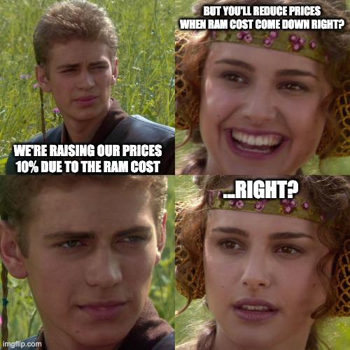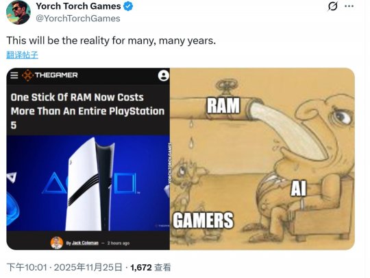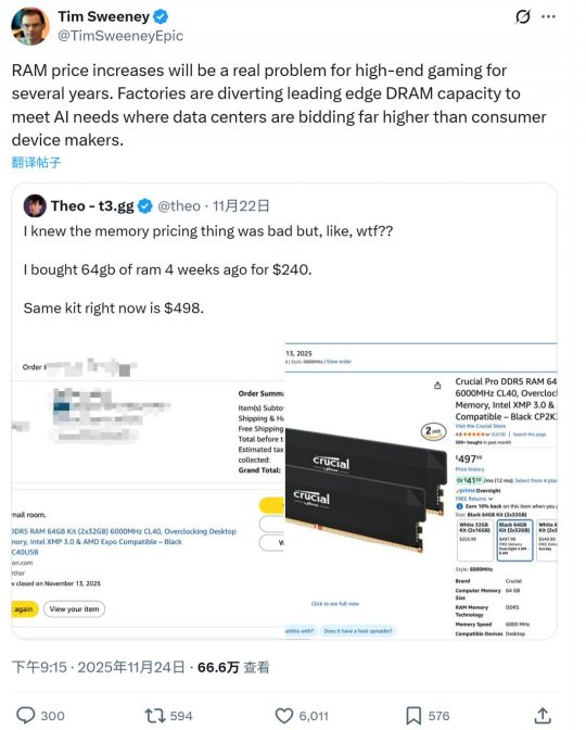 当前内存(RAM)行业的紧张局势令所有人担忧,价格飞涨,就连消费级显卡也要喊着涨价,此前AMD已经打算涨价10%,而英伟达也有类似打算。业界高管认为这一波严峻形势恐怕会持续多年,非常不利好高端3A游戏。 Epic Games CEO Tim Sweeney认为,价格上涨将对游戏行业产生影响,甚至可能持续数年。 他说:“未来几年,内存价格上涨将对高端游戏构成严峻挑战。工厂正将尖端DRAM产能转向满足人工智能需求,而数据中心的出价远高于消费电子设备制造商。” 坊间传闻,游戏主机价格可能进一步上涨。即将推出的RTX 50 Super等显卡也可能面临供应问题。 64GB内存当前价格已经快赶上RX 9070XT显卡,比一整台PS5还贵 网友:没关系,过一段时间价格会降下来吧,是……吧? 这一波内存涨价潮,游戏玩家成为最大牺牲品 |
