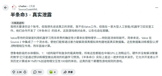 一名自称参与《半条命3》技术合作的人工智能开发者近日在Reddit相关论坛发帖,称Valve计划在2025年12月11日公布该作。不过,该消息尚未获得官方证实。 发帖者“Source2LeakAIML”表示,自己并非Valve员工,但所在的人工智能/机器学习研究机构正在与Valve合作,为《半条命3》开发新的物理模拟技术。该用户的身份与相关内容均未被独立验证。 根据其说法,《半条命3》在开发过程中面临的主要障碍并非剧情或设计,而是物理系统的计算成本。发帖者称,Valve正在引入一种以机器学习方式加速物理计算的新流程:在训练阶段通过高精度模拟生成数据集,再以此训练模型,使其能够在实时状态下预测复杂的物理交互,包括液体模拟、结构破坏与车辆物理等。他声称,这一方法能够在中端GPU上实现更高规模的物理表现。 发帖者表示,该技术可显著降低计算资源消耗,并称《半条命3》计划作为该技术的示例项目。他在后续评论中再次提到“12月11日”为游戏公布日期。 “最后的信息:12月11日是《半条命3》的公布日期。也许我会在12号回来,回答更多关于物理技术的问题。准备好被震撼吧!” 此外,外媒Insider Gaming记者Mike Straw近期也表示,《半条命3》有望在本月内公布。但目前,Valve方面未就相关传闻作出回应。 |