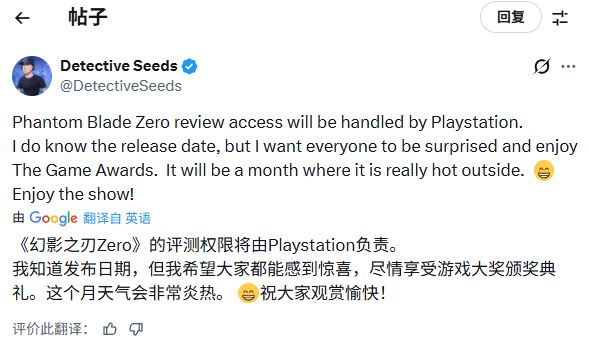 TGA官推宣布,国产3A武侠动作游戏《影之刃零》将于12月12日全球直播的TGA颁奖典礼上公布其发售日。 在官方发布消息后,知名爆料人@Detective Seeds在社交媒体X上发文透露: “《影之刃零》的评测权限将由PlayStation 负责安排。我确实知道发售日期,但我希望大家能在TGA上获得惊喜并享受这一刻。发售时间会是在一个天气非常炎热的月份。祝大家观赏愉快!” 此外,爆料人还在评论区补充道,这里说的特指美国的季节气候。 根据现有信息来看,《影之刃零》正式发售日期很有可能定在2026年夏季。由于文中提到“非常炎热”,大概率为7月或8月。 不过值得注意的是,此次发言仅为爆料,真实性有待确认,更多内容待官方后续公布。 |