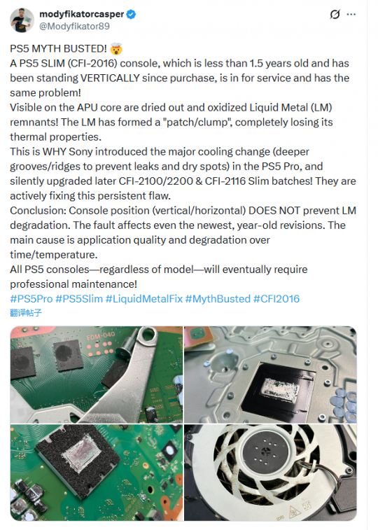 随着PlayStation 5主机即将步入产品生命周期的第六年,近日有专业维修人士指出,所有PS5机型内部用于关键散热的液态金属材料,随着时间推移均可能出现性能退化,最终需要专业维护,这一潜在问题引发了玩家社区对主机长期可靠性的关注。 该预警源于改装者兼维修技术人员Modyfikatorcasper在社交媒体发布的案例分析。他展示了一台使用不足一年半的PS5 Slim(型号CFI-2016),其位于加速处理器单元与冷却系统之间的液态金属已发生明显退化。材料出现干涸、氧化,并凝结成块状,完全丧失了将芯片热量高效传导至散热器的关键物理特性。 Modyfikatorcasper明确指出,此问题影响所有PS5机型,并非个别案例。他认为,这甚至是促使索尼在PS5 Pro设计中采用带有更深凹槽散热器的原因之一,以更好地防止液态金属泄漏或干涸。他还证实,索尼后续通过推出CFI-2100、CFI-2200及CFI-2116等修订型号,对冷却系统进行了类似的升级改进。他特别强调,主机的水平或垂直放置方式与此问题的发生无关,液态金属的性能衰减仍会发生。 “主机摆放姿态无法防止液态金属退化。该故障甚至影响最新的、仅使用一年的型号。主因是涂覆工艺质量以及随时间与温度发生的材料退化,”他总结道,“所有PS5主机——无论何种型号——最终都将需要专业维护!” 当被问及这是否仅为个别瑕疵品时,Modyfikatorcasper基于其维修经验回应称,他已处理过多台因过热故障送修的PS5。不过,需指出的是,索尼官方目前尚未就旧款PS5可能普遍存在此问题发表任何声明。也有分析认为,维修技师的视角可能存在一定的“确认偏误”——因其日常工作频繁接触故障设备,可能放大对问题普遍性的感知。 如果该问题在更广泛的PS5存量设备中被证实,由于其属于内部材料老化,在保修期内的设备很可能受到索尼官方保修政策的覆盖。对于已过保的主机,用户则可能面临付费维护的选择。此事的发展,有待索尼官方的进一步回应与说明。 |