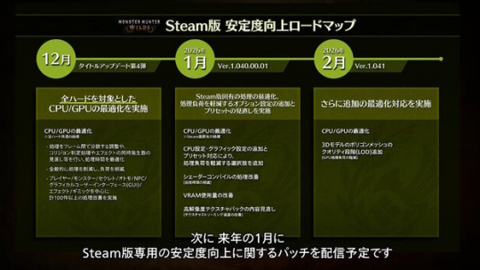 ·12月16日的免费更新将是本作最后的大型更新,接下来将不会有多项内容的追加更新,而是以及继续优化Steam版游戏体验和修复问题为主要更新方向,在2026年2月,本作会迎来最终更新,小规模追加新内容主要是新的历战王挑战等等。