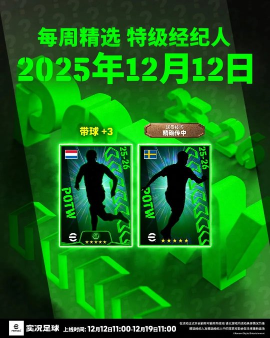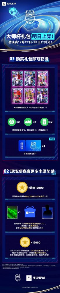 他是永恒之城的精神图腾 细腻优雅的脚法、势大力沉的远射 他以与生俱来的创造力主宰进攻节奏 书写了一段属于荣耀与浪漫的史诗! 双增能史诗高光托蒂即将登场! 天下武功,唯快不破! 他有着傲人身高和一双“大长腿” 以37.38km/h的瞬时速度冠绝英伦赛场 将任何试图突破他的前锋拒之门外! 双增能梦幻精选范德芬也将联袂登场! 2025大师杯总决赛月底将在广州打响! 购买大师杯礼包还可获得经纪人以及丰厚道具 快来现场为选手加油助威,赢取更多福利! 活动一览 群雄逐鹿 高光 特级经纪人 (1.5倍不重复高光) 红白交响曲 必得不重复 概率提升经纪人 大师杯礼包? 每周精选 特级经纪人 (12.12~12.19) 双十二 晋级之路 实况足球 在线对抗赛 双十二 累计充值 活动详情 群雄逐鹿 高光 特级经纪人 (1.5倍不重复高光) 双增能史诗高光托蒂、鲁伊·科斯塔、范尼斯特鲁伊将通过【群雄逐鹿 高光 特级经纪人(1.5倍不重复高光)】首次登场!除此之外,你还将有机会获得双增能史诗高光马克莱莱、里杰卡尔德、巴蒂斯图塔、阿比亚蒂。想要补强球队的玩家们,千万不要错过此次活动! *获得5星球员的概率将提升到1.5倍。 *活动期间玩家有3次“不重复高光机会”:通过本经纪人抽取出的高光球员,必定为您队伍中未拥有的。 *若玩家已拥有本经纪人内所有高光球员,“不重复高光机会”将没有效果。 *若玩家通过解约导致队伍中的高光球员转为未拥有状态,该球员会通过本经纪人被重复抽取,并消耗一次“不重复高光机会”。 托蒂 在红狼军团,他是永恒不倒的旗帜;在意大利国家队,他是敢于在决胜时刻站出来的关键先生。球场上的托蒂脚下技术细腻,视野开阔,传球如手术刀般精准,四两拨千斤的标志性吊射更是优雅无比,以大师般的气质让球队的进攻井然有序! *增能后球员总评可达102分,上阵最大总评可达106分 2006年世界舞台,带伤出征的托蒂依旧是意大利进攻线上的核心之一。他以稳定的组织与精准的传球串联起蓝衣军团的前场攻势,在7场比赛中送出4次助攻,荣膺该届赛事的助攻王,最终帮助意大利第四次站上世界之巅! 托蒂增能属性为【进攻发动机 +3】 传控的增强让他的进攻更上一层楼! 托蒂自带特殊技能【掠地瞬击】 他在禁区外轻巧过人后起脚劲射 皮球贴着草皮疾速飞入网窝! 拥有【无定型射门】特殊技能的托蒂 突入禁区背身护球后突然起脚 打出一记直挂球门死角的高质量射门! 89分地传和90分空传赋予了他出色的策应能力 他接队友传球后无需调整,送出精准直塞 助攻前插的队友形成单刀,轻松完成破门! *活动详情及规则请以游戏内活动公告为准 活动时间: 2025/12/12 11:00~2025/12/19 11:00 红白交响曲 必得不重复 概率提升经纪人 双增能梦幻精选范德芬、科纳特、罗伯逊将通过【红白交响曲 必得不重复 概率提升经纪人】首发登场!除此之外,你还将有机会获得双增能梦幻精选阿利松。喜欢他的玩家千万不要错过啦~ *随着玩家抽取次数的提高,抽到指定梦幻精选球员的概率会根据初始概率提高,最高提升至50倍。当150抽未能获得梦幻精选球员时,第160抽将获得不重复梦幻精选球员球员。 范德芬 他身高出众,却快若闪电,是后防线上最令人安心的“疾速扫荡机”。他那足坛顶尖的绝对速度和强硬的对抗能力,往往能在回追防守时抹平对手的身位优势,用一次次不可思议的极限救险,持续刷新着现代足球防守者的速度极限! *增能后球员总评可达100分,上阵最大总评可达104分 2024-2025赛季,范德芬彻底进化为赛场上令人绝望的后防梦魇。这位创造英格兰联赛最高瞬时速度的后防“超跑”凭借一次次回追和封堵,成为白百合军团的后防基石。不仅如此,他还在欧洲联赛决赛中上演门线惊天倒钩解围,帮助球队斩获冠军,获得下赛季的欧战资格!本赛季的他更是将速度与高度的双重优势在进攻端全面拉满,既有从后场开始一路狂奔,完成千里走单骑般的一条龙破门,也有单场头球梅开二度的精彩表现! 范德芬增能属性为【抢断 +3】 防守和爆发的增强让坐镇后防的他无懈可击! 范德芬自带特殊技能【伸脚抢截】 他用积极精准的出脚完成抢断,阻断进攻! 顶级的四项防守数据搭配出色的灵活性 范德芬既能预判传球路线完成拦截 也能够利用速度优势快速回追防守! 96分的铲球数值让他化身“球场铲车” 用暴力而精准的飞铲破坏对手的进攻! *活动详情及规则请以游戏内活动公告为准 活动时间: 2025/12/12 11:00~2025/12/19 11:00 大师杯礼包 2025实况足球大师杯线下总决赛将于12月27~28日正式开战!购买【大师杯礼包】,不仅可获得【大师杯精选经纪人(10%含梦幻精选)】、技巧训练*2、随机增能道具*2、位置训练*2,还可获赠线下观赛门票。线下决赛当天抵达现场,凭门票可获得大师杯现场精选球员*1,还有金币抽奖活动与精美周边等你亲临体验。 此外,比赛现场将设置「实况女玩家PK」环节!端游/手游任选对战,获胜者赢12000金币,女生也能玩转实况!比赛名额有限,先到先得哦! 快来现场感受顶尖实况高手的巅峰对决,见证年度冠军的诞生吧! 活动时间: 2025/12/12 11:00~2025/12/19 11:00 每周精选 特级经纪人 (12.12~12.19) 【每周精选 特级经纪人(12.12~12.19)】即将上线,你将有机会获得本周在赛场表现优异的精选球员。 在上周英格兰联赛中,这位球队新援先是以一记精准横传助攻队友打破僵局,随后他又在中场完成
