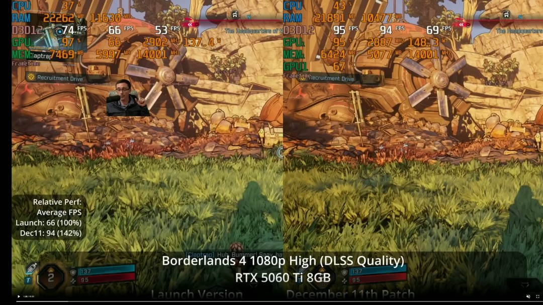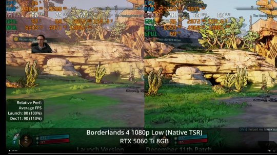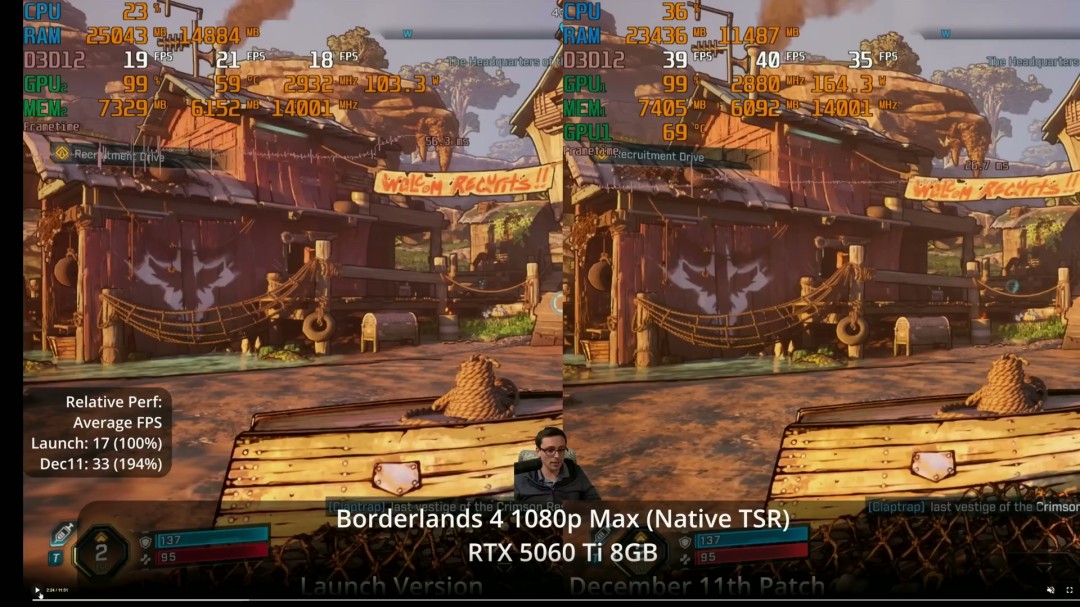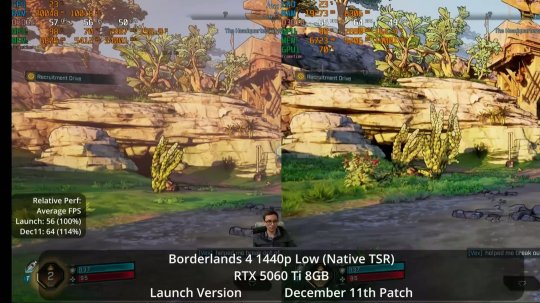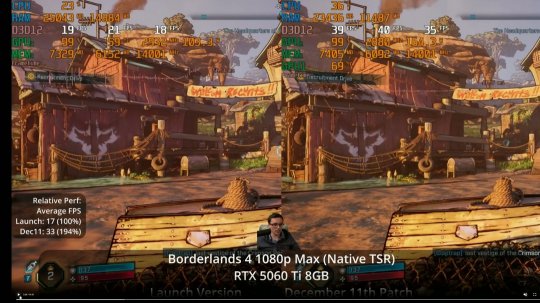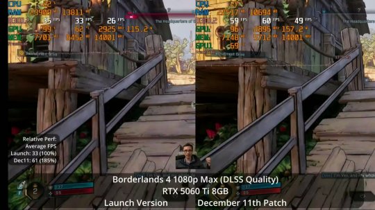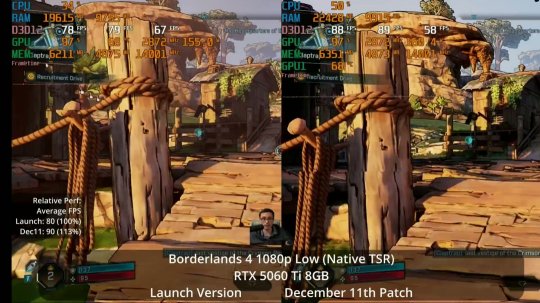 《无主之地4》PC版首发存在严重的性能问题。游戏优化很差,存在诸多技术缺陷。如今,在发售三个月后,12月11日,2K和Gearbox为《无主之地4》推出了一项大更新,承诺修复其中许多问题。根据油管博主的实测,这一次2K似乎大大改进了《无主之地4》PC版的性能。 油管频道Daniel Owen测试了此次更新。在配备8GB显存的显卡上,性能提升非常显著。得益于此次更新,现在即使是像RTX 5060Ti 8GB这样的显卡,也能在高画质设置下以更高的帧数运行《无主之地4》。在最高画质设置下,性能几乎可以翻倍。 测试结果: 1080P,高画质,原生TSR,首发版 vs 12.11补丁后帧数对比(44 vs 64),提升45% 1080P,最高画质,DLSS质量,首发版 vs 12.11补丁后帧数对比(33 vs 61),提升85% 1080P,高画质,DLSS质量,首发版 vs 12.11补丁后帧数对比(66 vs 94),提升42% 1080P,低画质,原生TSR,首发版 vs 12.11补丁后帧数对比(80 vs 90),提升13% 关于卡顿问题,游戏似乎仍然存在一些着色器编译卡顿。不过,整体体验比游戏刚发售时要好得多。《无主之地4》现在的卡顿现象减少了。所以,这并非只是权宜之计,它确实有所改进。 确切地说,《无主之地4》现在采用了配置文件引导优化(PGO)。据开发人员,这可以提高游戏的运行效率,并大幅提升CPU性能。他们通过更新网格和材质,优化了草地、灌木和其他植被,从而降低了屏幕渲染成本。 此外,开发团队还加入了来自新版虚幻引擎的多项GPU优化。流明光照、植被反射和水体性能均得到提升。游戏内过场动画的帧率也从锁定30帧提高到了更高的帧率。低端PC的性能也得到了进一步优化,尤其是在草地、动态阴影和风效等场景下。 但这还不是全部。12月11日的更新通过重新组织纹理和网格内存池,改进了显存的使用方式,使游戏在较低的图形设置下也能保持更高的视觉质量,而不会影响性能。这将显著提升配备8GB显存的GPU的性能。 官方还改进了物理和Niagara,以减少内存泄漏和内存不足导致的崩溃。布料初始化也得到了改进,从而减少了加载和生成时间。开发人员还改进了着色器预编译阶段。因此,玩家在游玩时遇到的卡顿现象将会减少。 另一项重大改进是移除了不必要的额外光源,特别是用于体积云的光源。12月11日的补丁还调整了部分区域的敌人和NPC生成数量,使其不再出现数量过多的情况。这有助于提升游戏性能,使游戏体验更加流畅。最后,此次更新还新增了图形选项,允许玩家关闭阴影、体积云和雾效。 RTX 5060Ti 8GB显卡测试: 1080P,高画质,原生TSR,首发版 vs 12.11补丁后帧数对比(44 vs 64),提升45% 1080P,最高画质,DLSS质量,首发版 vs 12.11补丁后帧数对比(33 vs 61),提升85% 1080P,低画质,原生TSR,首发版 vs 12.11补丁后帧数对比(80 vs 90),提升13% 1080P,高画质,DLSS质量,首发版 vs 12.11补丁后帧数对比(66 vs 94),提升42% |