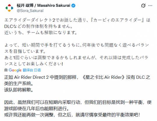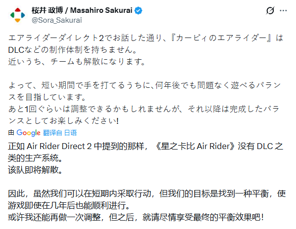 近日,知名游戏制作人樱井政博通过社交媒体宣布,其最新作品《星之卡比:飞天骑士》将不会推出任何DLC等追加内容,并且该游戏的开发团队也将在不久后解散。此消息在稍早前举行的“飞天骑士 Direct 2”活动中已有所披露。 樱井政博在推文中解释道,由于团队解散在即,他们当前的目标是通过平衡性调整,确保游戏在未来数年都能被玩家无忧地享受。据悉,《星之卡比:飞天骑士》的Ver1.2.0更新已正式上线,包含大量错误修复、体验优化与平衡性调整。 樱井政博进一步透露,在此次更新之后,游戏可能仅会再进行一次补丁更新。“我想我们或许还能再调整一次,但在此之后,就请将游戏的平衡性视为‘最终版’来享受吧。”他如此评论道。 在近年多数买断制游戏均通过持续不断的补丁与更新来维持活力的行业趋势下,这一“就此定版”的决定显得颇为独特。此举或许能让开发团队成员得以休整,并全身心投入到各自未来的新项目之中。 |